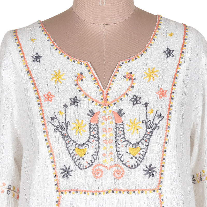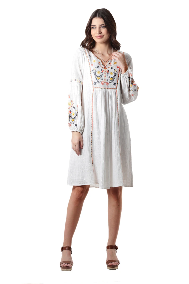 Heralding spring, a pretty pair of songbirds embellish this breezy cotton dress. Anchal Ahuja designs this bohemian beauty, which features bishop style sleeves, gathered bodice and a hint of silvery Lurex threads woven throughout. Side seam pockets and full cotton lining.