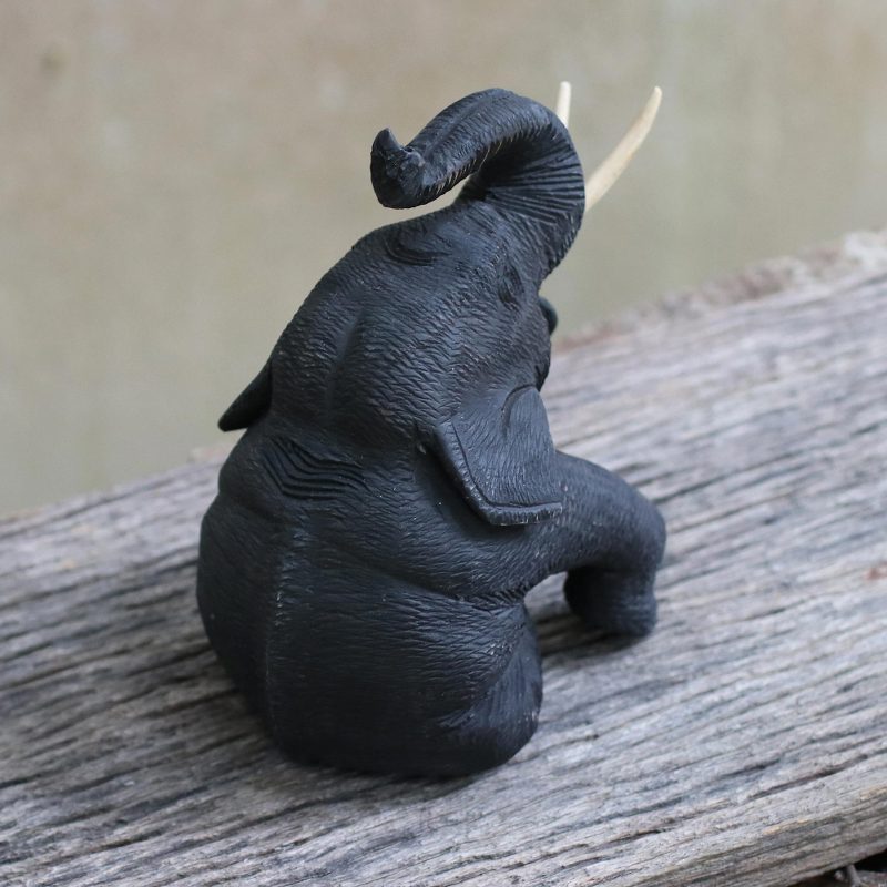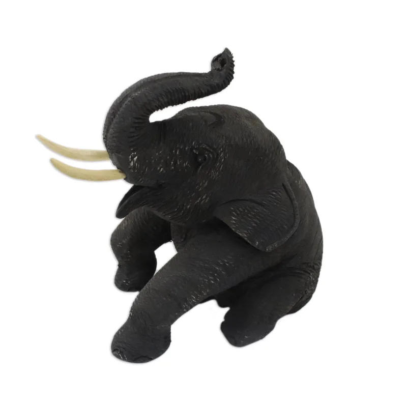 Delivery EstimateAn amiable Thai elephant seems to lift a foot in a sign of welcome. The rotund pachyderm radiates mirth. By Amporn, this realistic statuette is carved from prized teak wood. She details the rugged, leathery skin, intelligent eyes, and alert ears, adding tusks of pale ivory darabela wood.