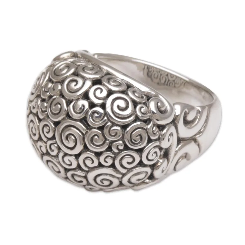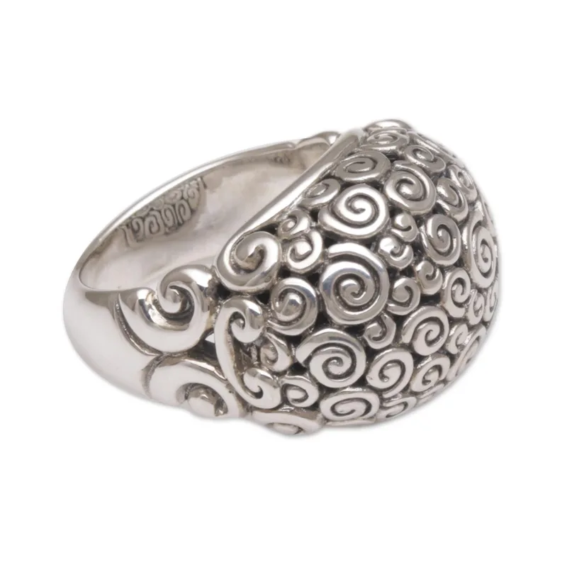 Sterling clouds are reflected in a sterling bubble that alights on a silver band. This lovely ring exhibits Zayd Makarim's meticulous craftsmanship and original design. The ornate silver patterns are inspired by the curls on the statues of Buddha in Borobudur Temple.