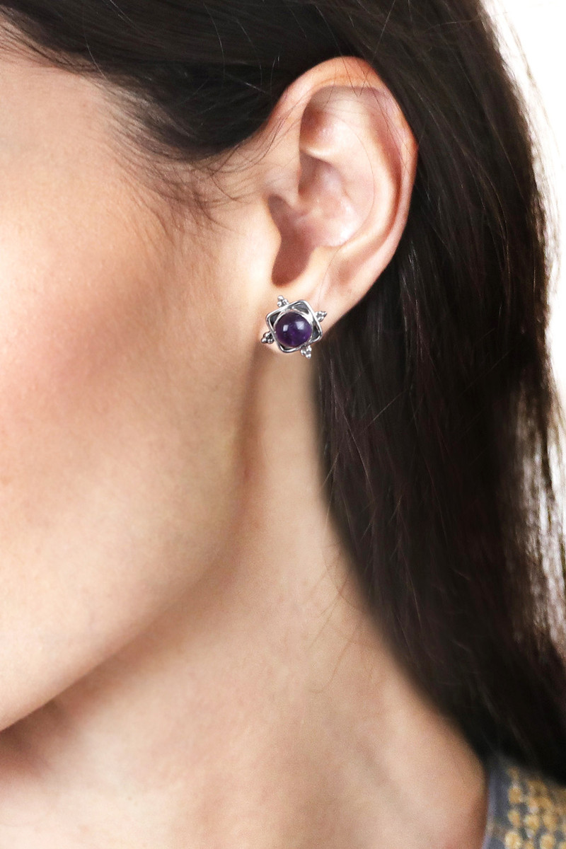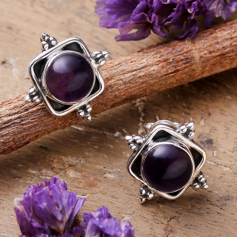 Defined and graceful forms compose this sterling silver pair, crafted with India's regal splendor. Presented by Shanker, these classic button earrings evoke an era of grandeur through their polished and oxidized details. At the center, amethyst cabochons add purple sparks, symbolizing wisdom.