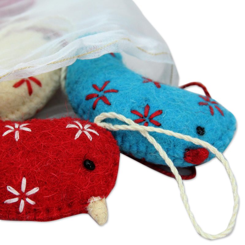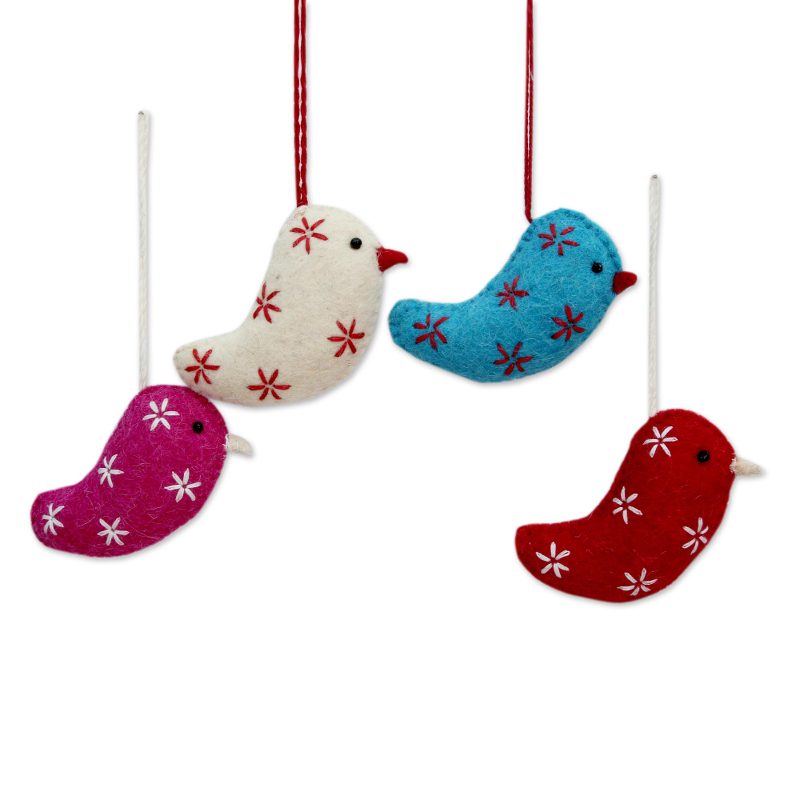 Four sweet birds bear tidings of joy for the holiday season and beyond in this ornament set from Rajesh Gehlot in India. The ornaments are hand-crafted of wool felt in red, ivory, turquoise, and bright pink, and embroidered with star-like flowers. The set of 4 ornaments features cords for hanging and arrives in a sheer polyester storage pouch.