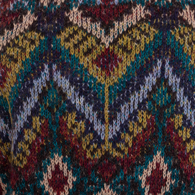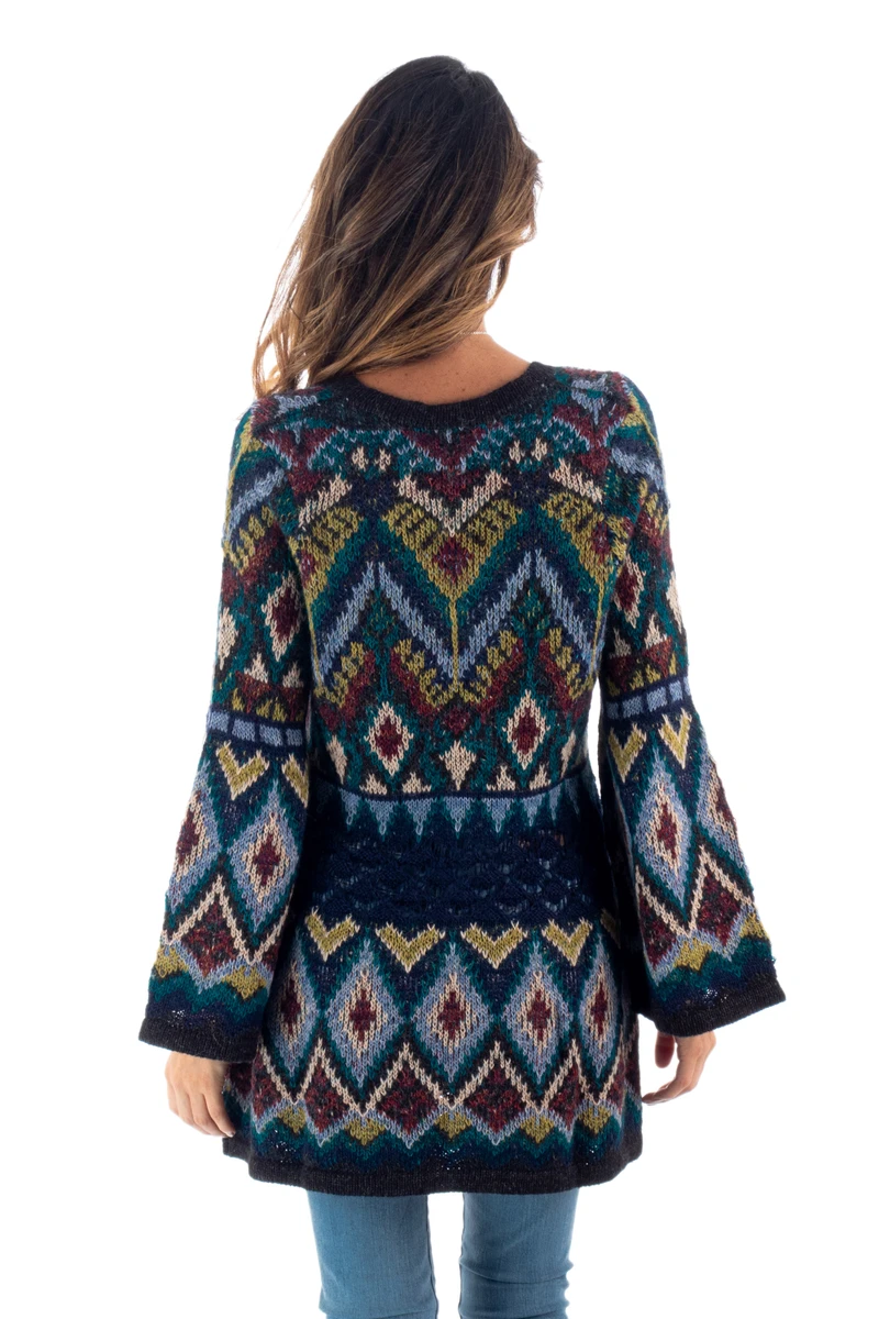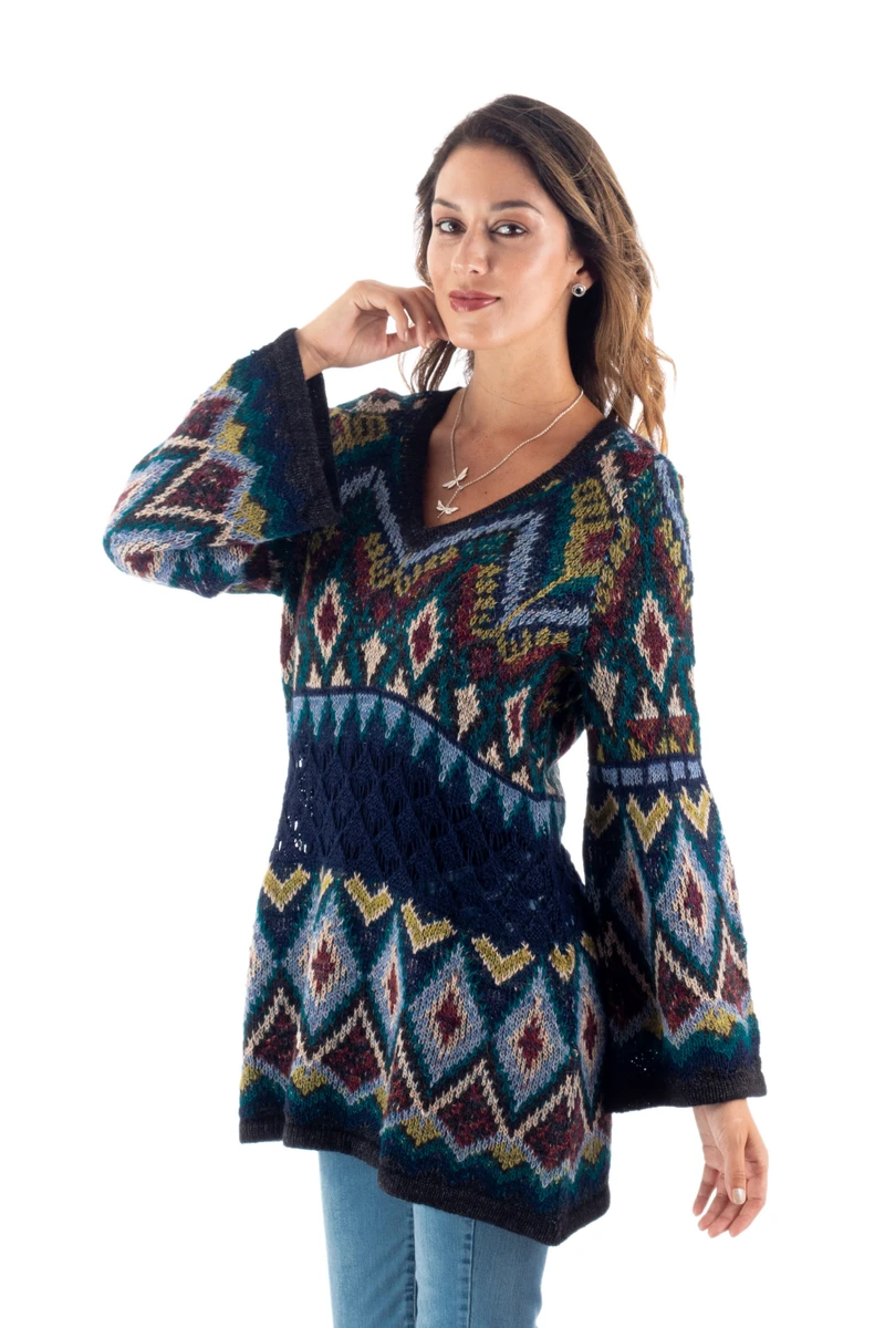 This enchanting long tunic sweater combines a multitude of fall colors and patterns ready for dressing up or a casual day out. An open knit panel at the mid-sleeve andbodice allows for the soft bell shape at the sleeveand hem. Benita Cutipa works in a luscious blend including baby alpaca - the fine fleece from the season's first shearing.
