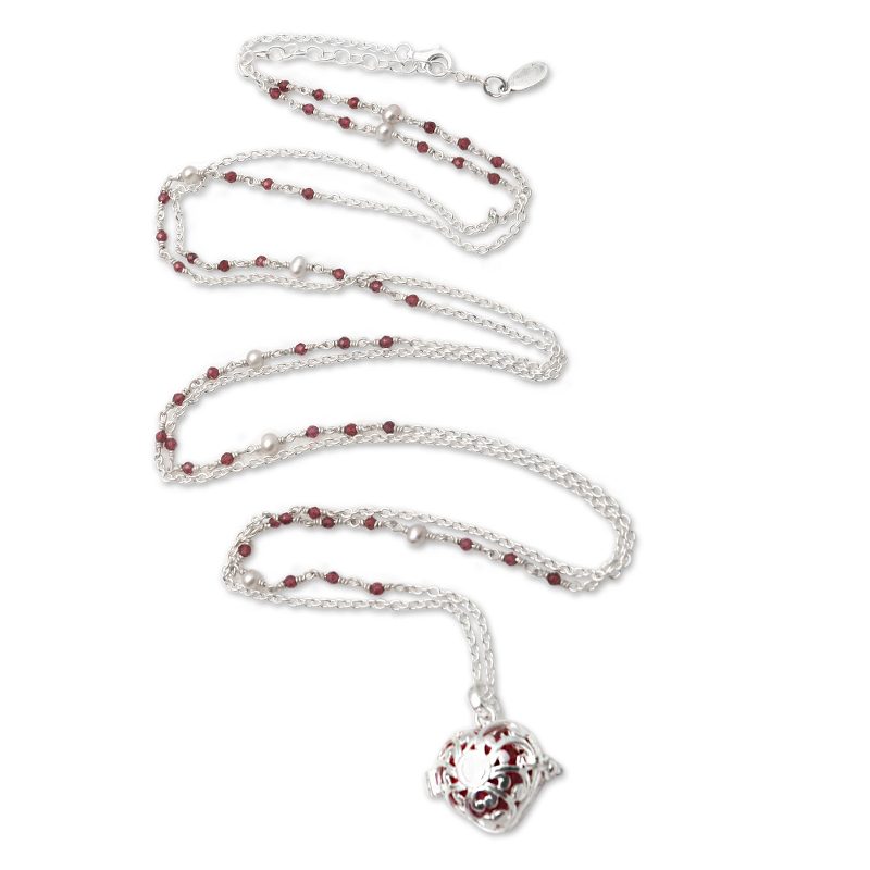 Lacy and lovely, a sterling silver locket holds a red enameled globe that chimes like a small bell. Ketut Sulastri crafts the necklace by hand with white cultured pearls and petite garnet gemstones along the long silver chain.