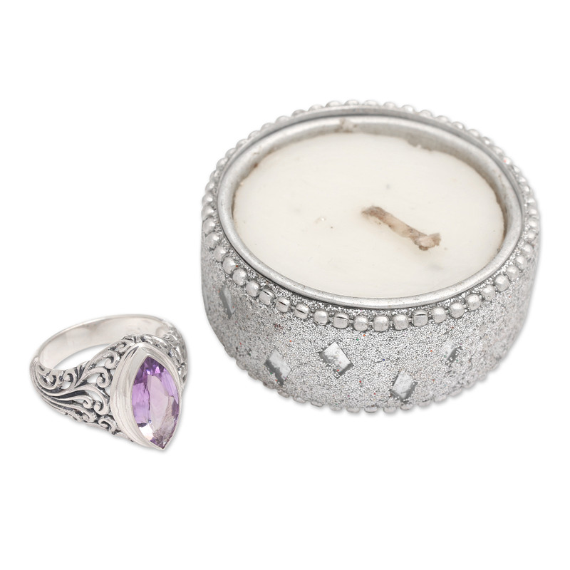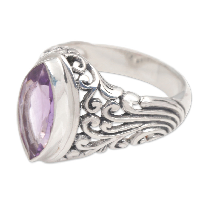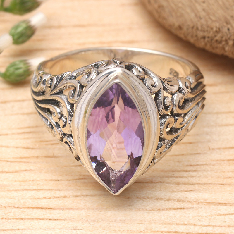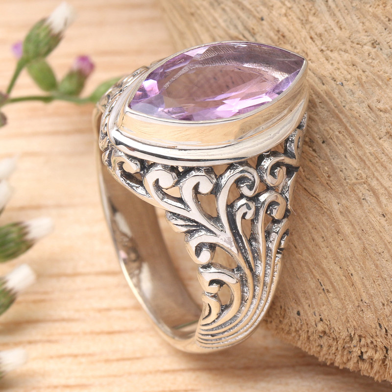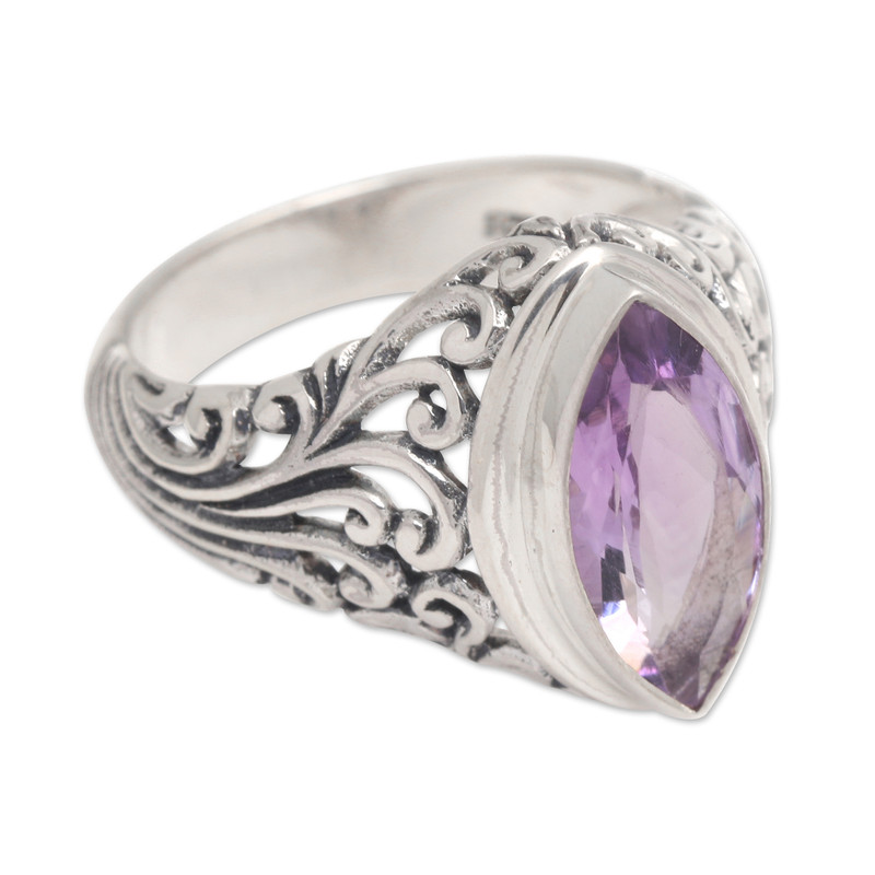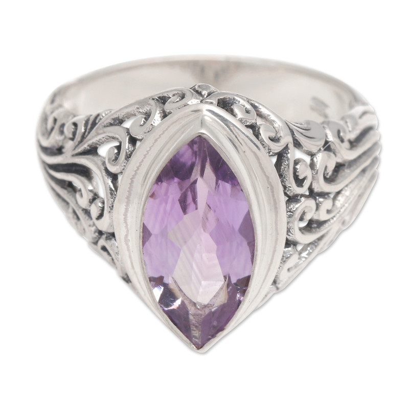 A marquise-cut amethyst evokes the sweet purple orchids that blossom in Bali. Weighing 1.5 carats, the gem is the centerpiece of Wirabhuwana's handcrafted sterling silver cocktail ring.