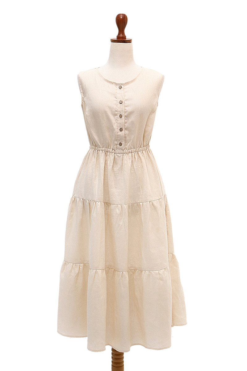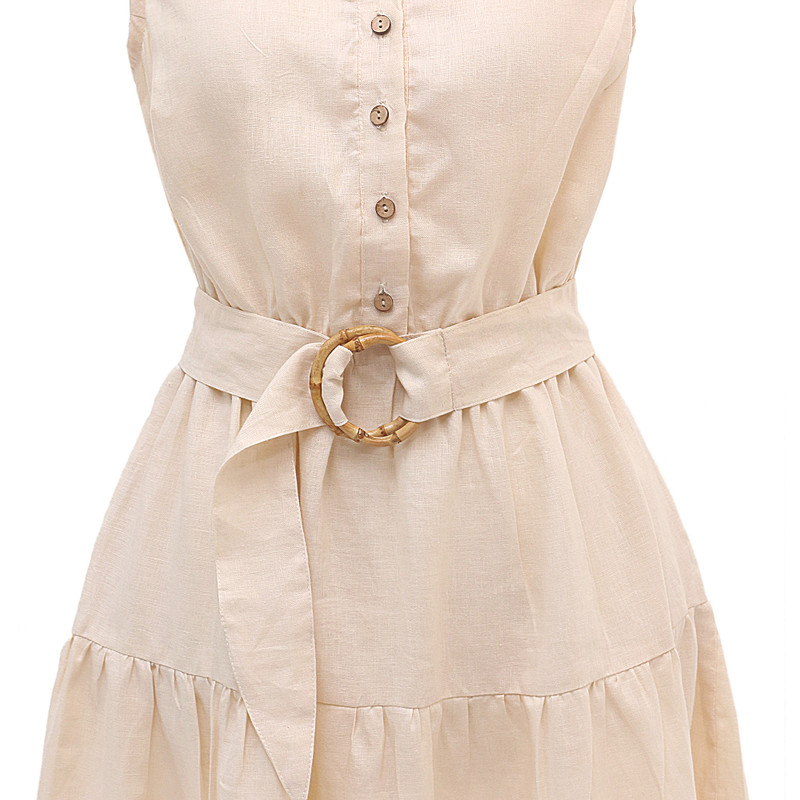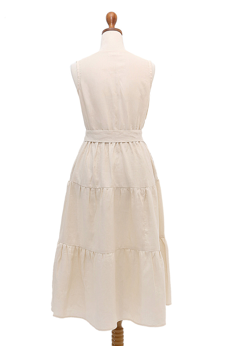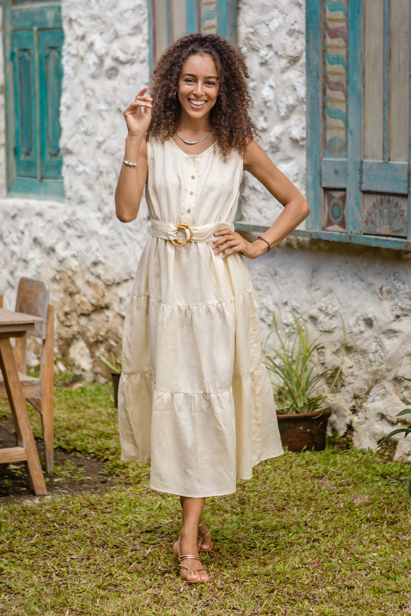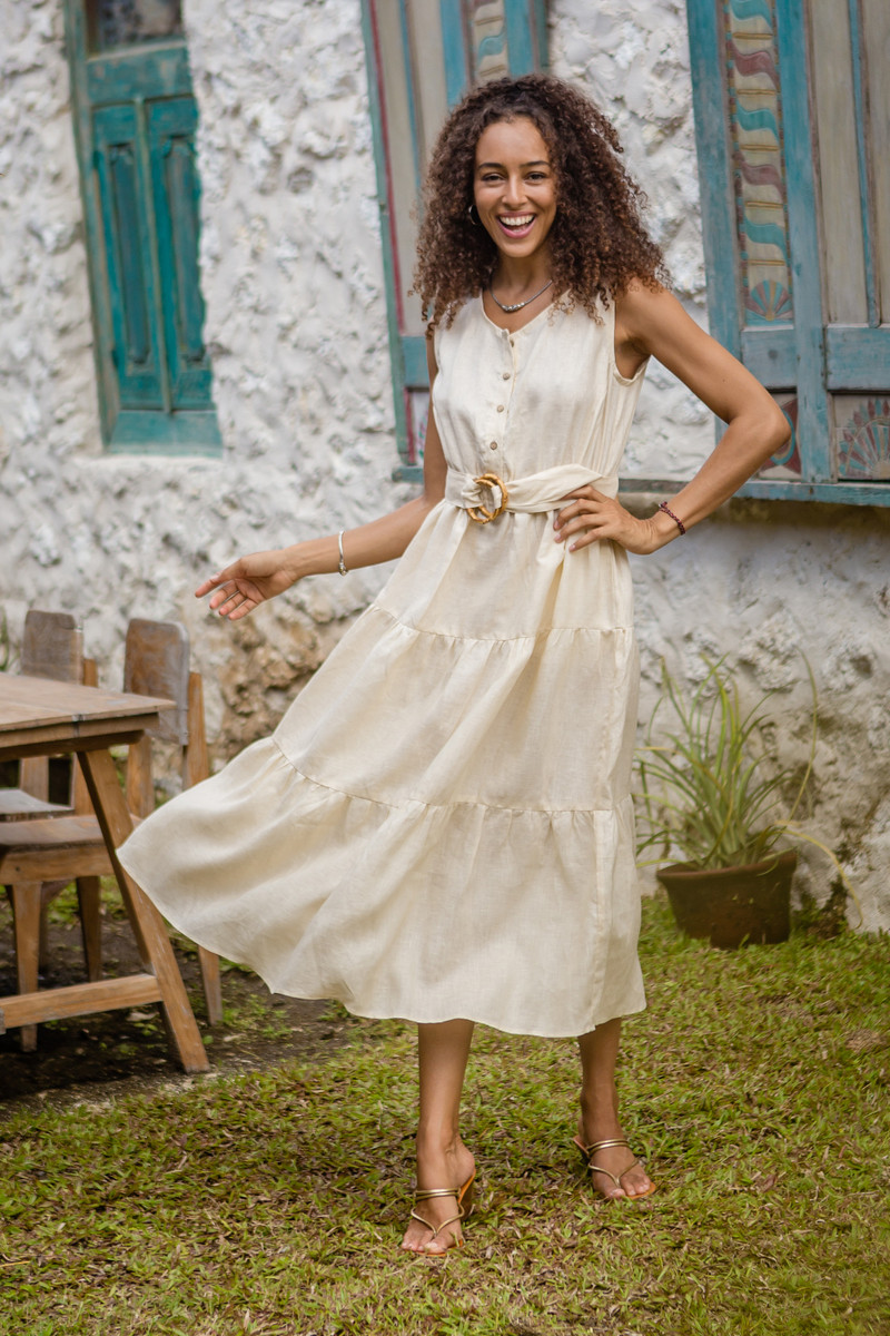 This beautiful linen garment will be the ideal outfit for summer soirees or special occasions with family and friends. Designed by Balinese artisan Endah, this beige tiered dress features a round neck, coconut buttons, pockets on each side, and an elastic waistband embellished with a rattan buckle belt. Add a radiant aura to your style with this gorgeous creation!