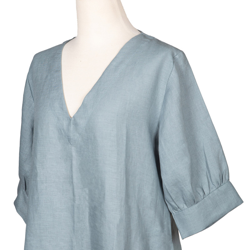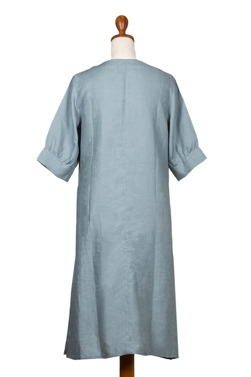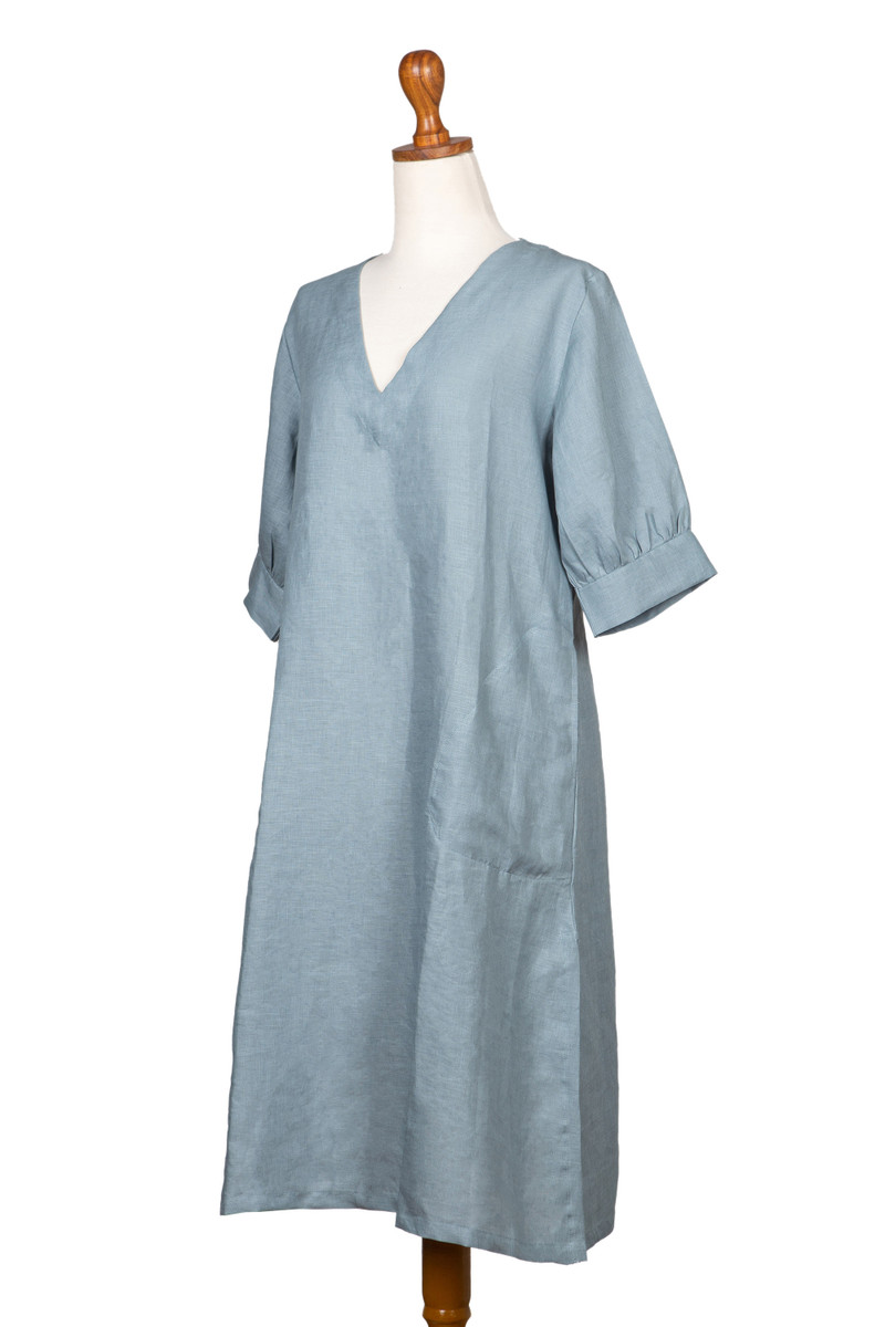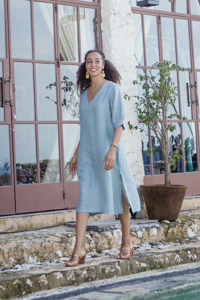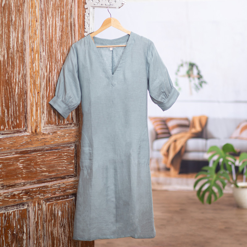 This beautiful linen garment will be a sweet addition to your wardrobe. Designed by Balinese artisan Endah, this tunic dress features a V-neckline and a solid pastel blue tone. The puffed sleeves add a warm touch, making a garment that complements many styles.