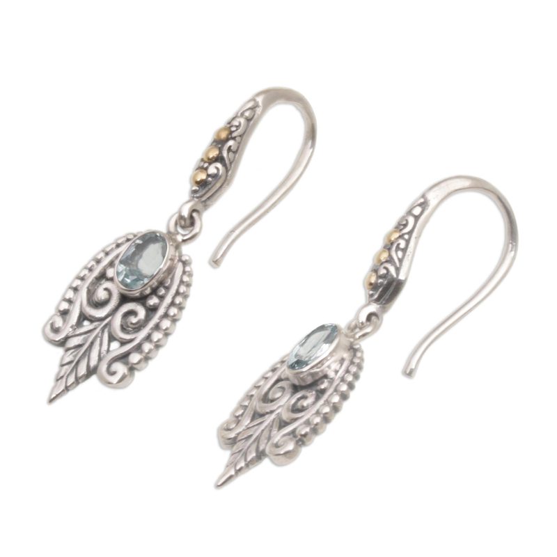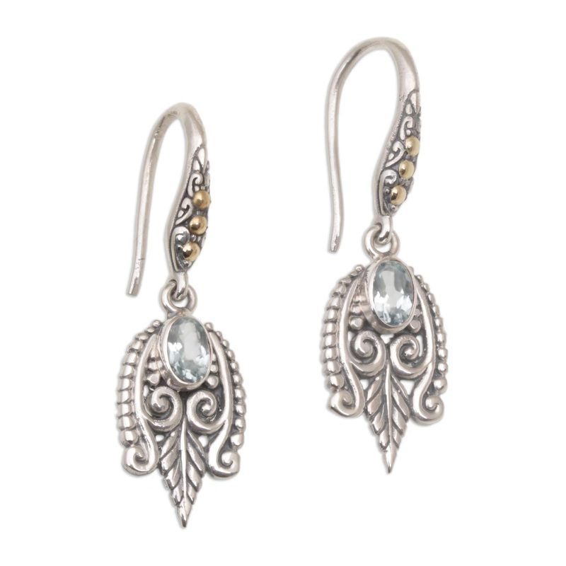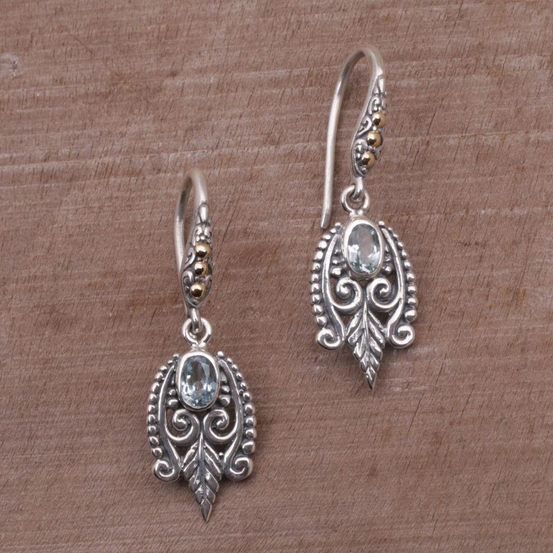 Backed by our 100% Happiness GuaranteeCaressed by dewdrops, stylized leaves embrace a faceted gem. Wayan Neri brings Balinese style to today's wardrobe with handcrafted dangle earrings. She works in sterling silver, adding blue topaz and accents bathed in 18k gold.