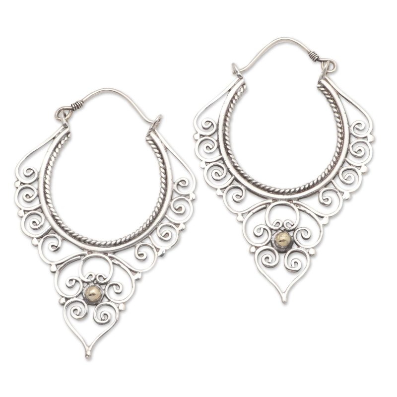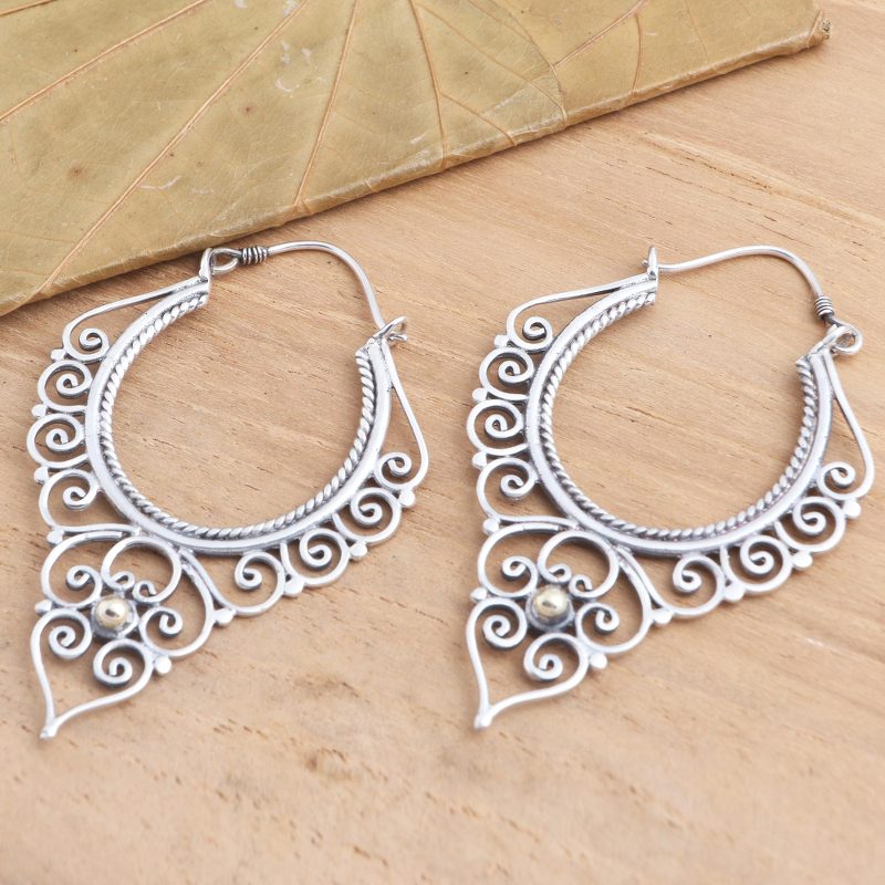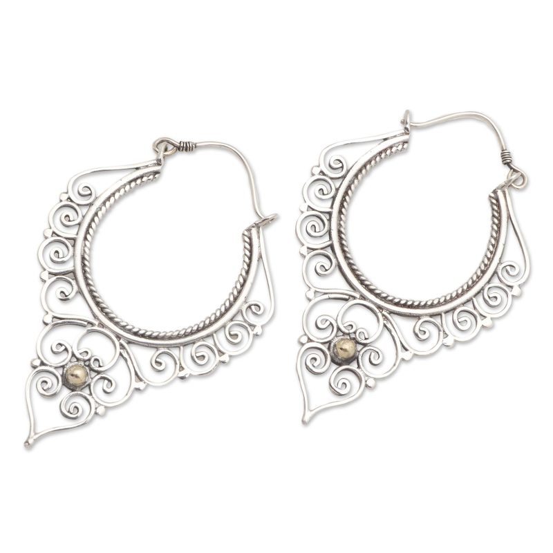 Dewi Putera of Bali presents these generously sized sterling silver hoops, crafted using a combination of handwork and casting. Intricate spiral and roping motifs--characteristic of Balinese jewelry design--are complemented by gold-plated accents, making them versatile enough to pair with other jewelry.