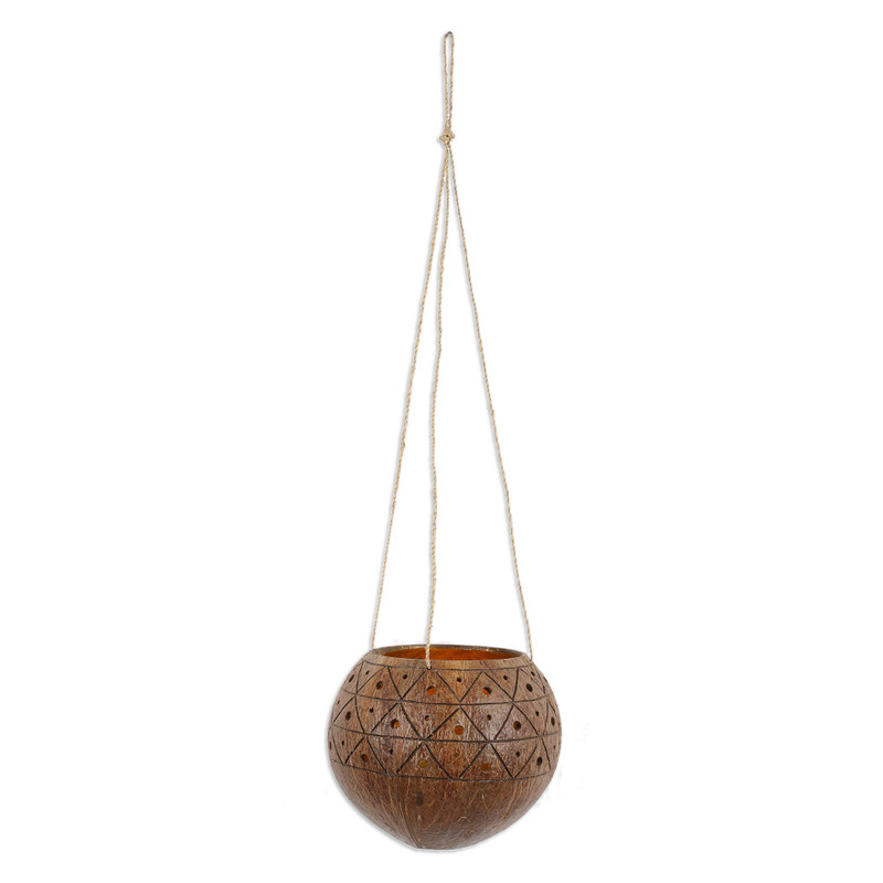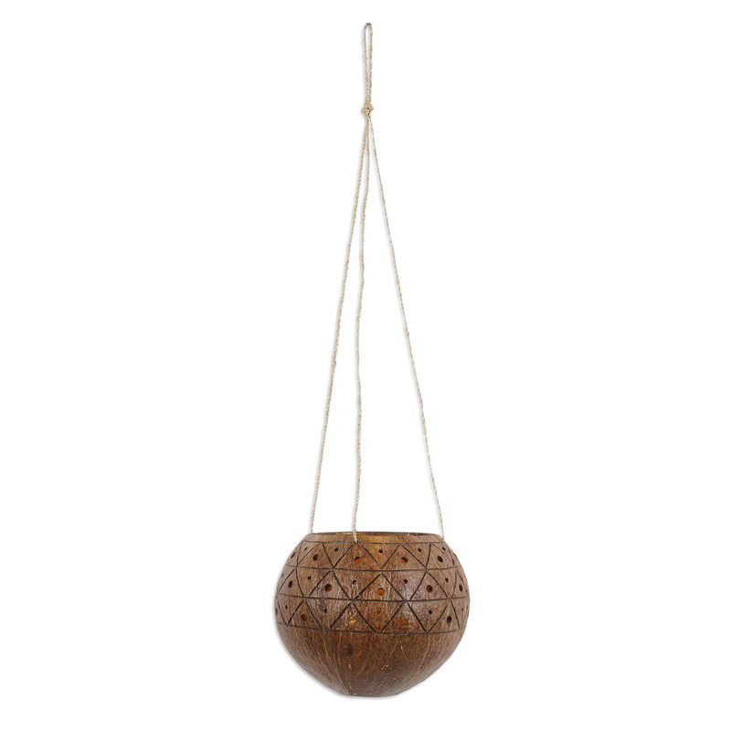 Enter a world of artistic wonder with this fabulous coconut shell hanging planter of geometric inspiration meticulously hand-carved in Bali. Designed by Sindhu Nata, this gorgeous accessory with openwork accents and carved triangle motifs brings a touch of rustic charm to any garden. And with the agel grass cord provided, it is effortless to hang and will transform any outdoor space into a breathtaking sanctuary.