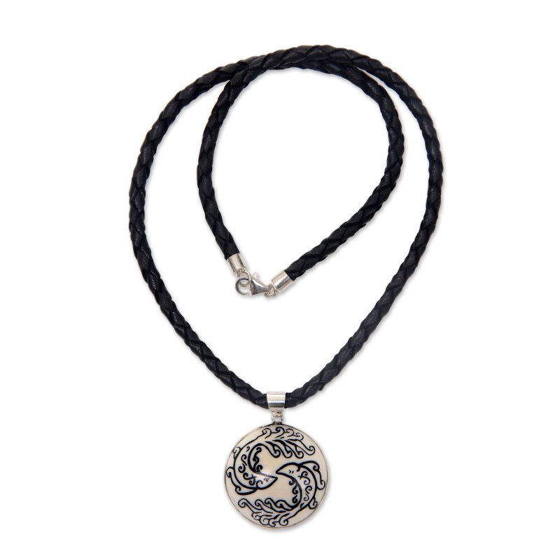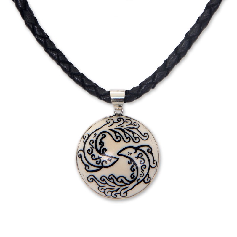 Carved by hand, this necklace is dedicated to the Zodiac sign of Pisces. Andi Rachmansyah crafts the pendant of bone to depict fish, rubbing the etched motifs with the dark ashes of sono wood. It is worn on a black leather cord with a sterling silver clasp.