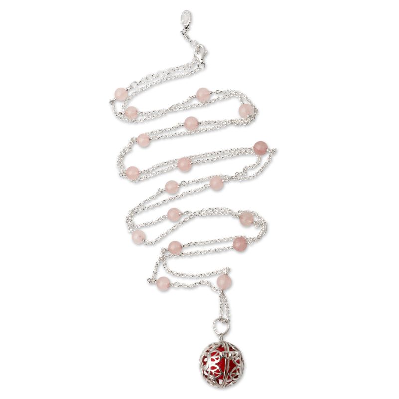 Working in sterling silver, Ketut Sulastri crafts a lacy pendant depicting the omkara symbol. The root of all sounds, this one letter is the emblem of the most high, and serves as a deeply significant and distinctly recognizable symbol for Hindu dharma. The pendant encloses a rosy enameled globe and hangs from a long chain punctuated by rose quartz beads.