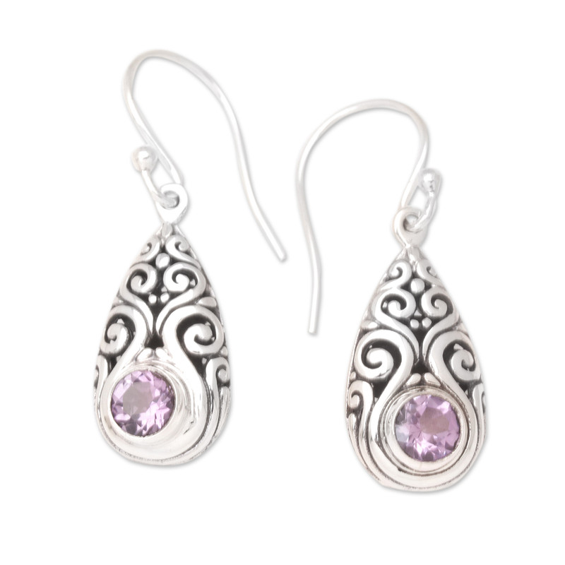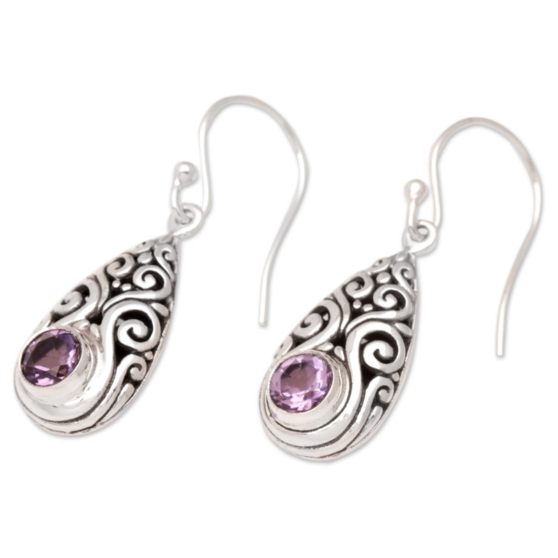 Backed by our 100% Happiness GuaranteeWisdom and serenity will walk by your side with these sterling silver dangle earrings featuring faceted amethyst stones illuminating the design with a glamorous purple tone. Artisan Made Sudiari crafts this breathtaking accessory with dedication, adding traditional motifs of her dearest Bali for a dapper accent.