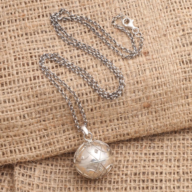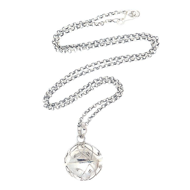 Also called "angel necklaces" and "harmony balls," Such necklaces are often worn by pregnant women in Bali and also in Mexico. Many wear it as an amulet. Others prefer a long chain that lets the pendant reach to the belly and the delicate sounds are thought to soothe the mother and the baby she is carrying. Some believe it summons a guardian angel, thus making it a symbol of loving protection.