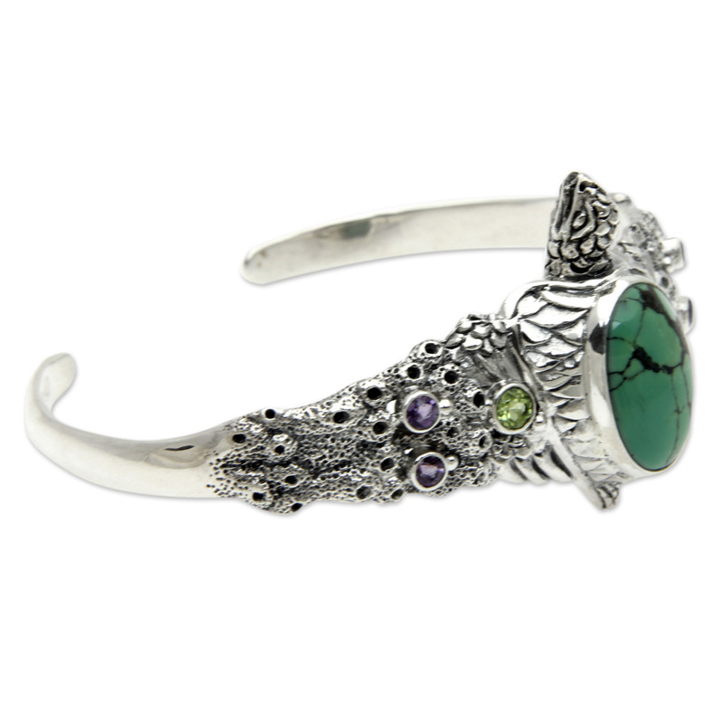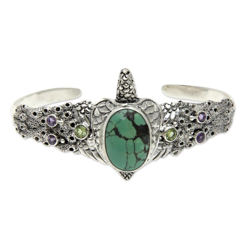 Look closely at the incredible detail in this sterling cuff. The turquoise-backed turtle crests a bubbling, foamy wave accented with petite peridot and amethyst stones. The artisans who work with NOVICA create works that sing with imagination.