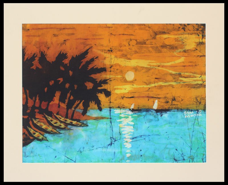 Backed by our 100% Happiness GuaranteeSamuel Ashong captures the magical beauty of a sunset as it ignites the skies over the ocean's waters. "The sunset has its own colors to brighten the evenings. One of the effects that has most attracted me over the years is the reflection of the setting sun on the rivers and the seas," he says. Ashong presents this exquisite batik composition in a mat board passe-partout, ready for framing.