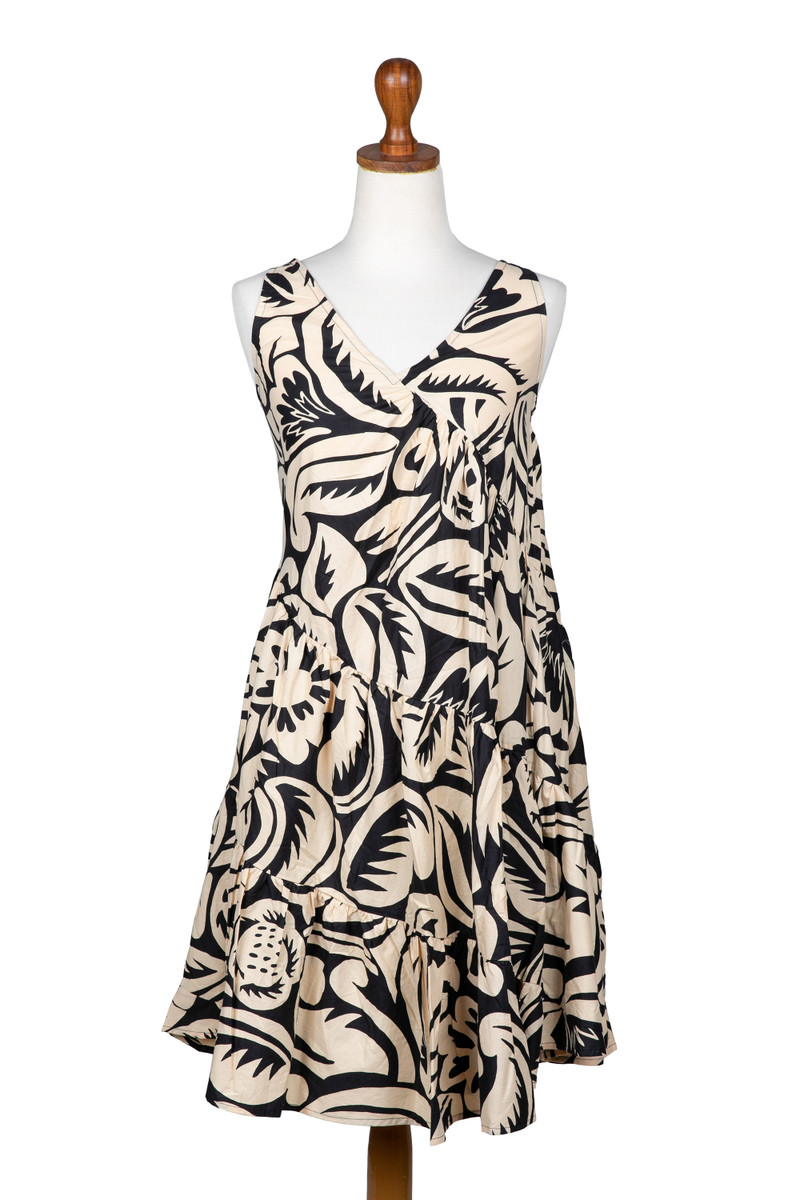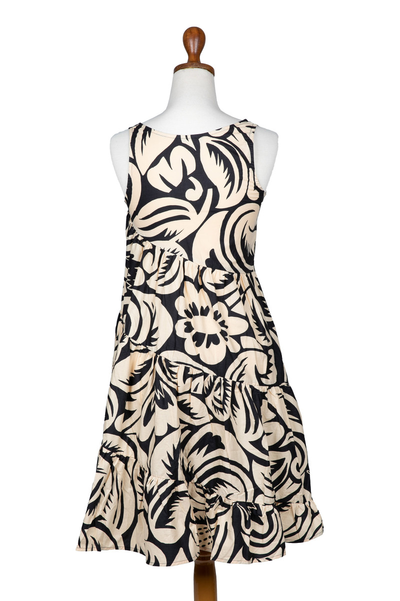 Hand-stamped batik evokes the night sea with voluptuous waves in black on beige. By Hari and Arthur, this delightful sundress features diagonal ruffles that swirl around the body. Its V-neck and easy fit make this design a classic.