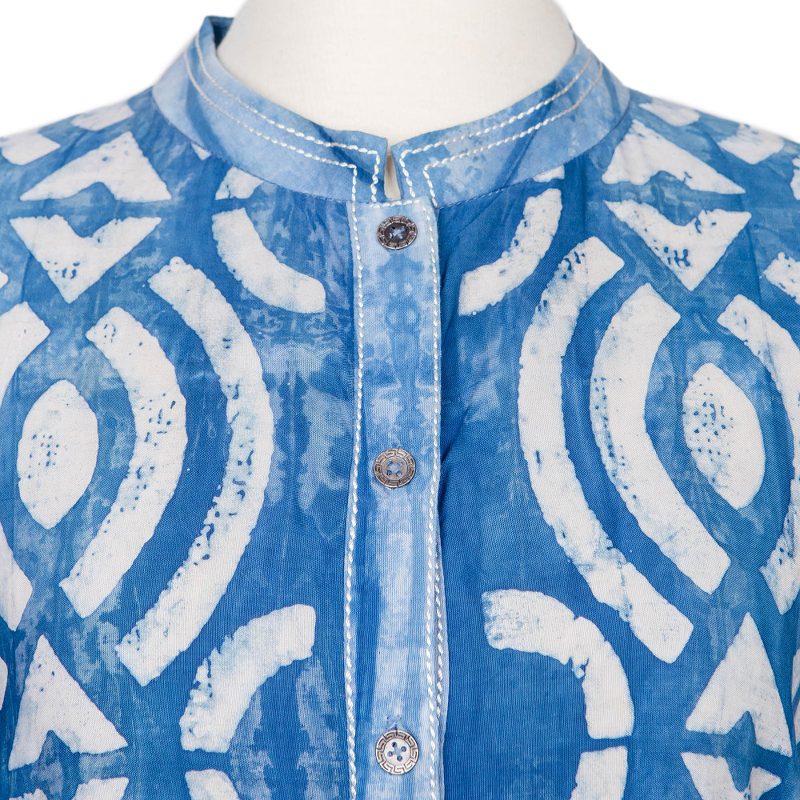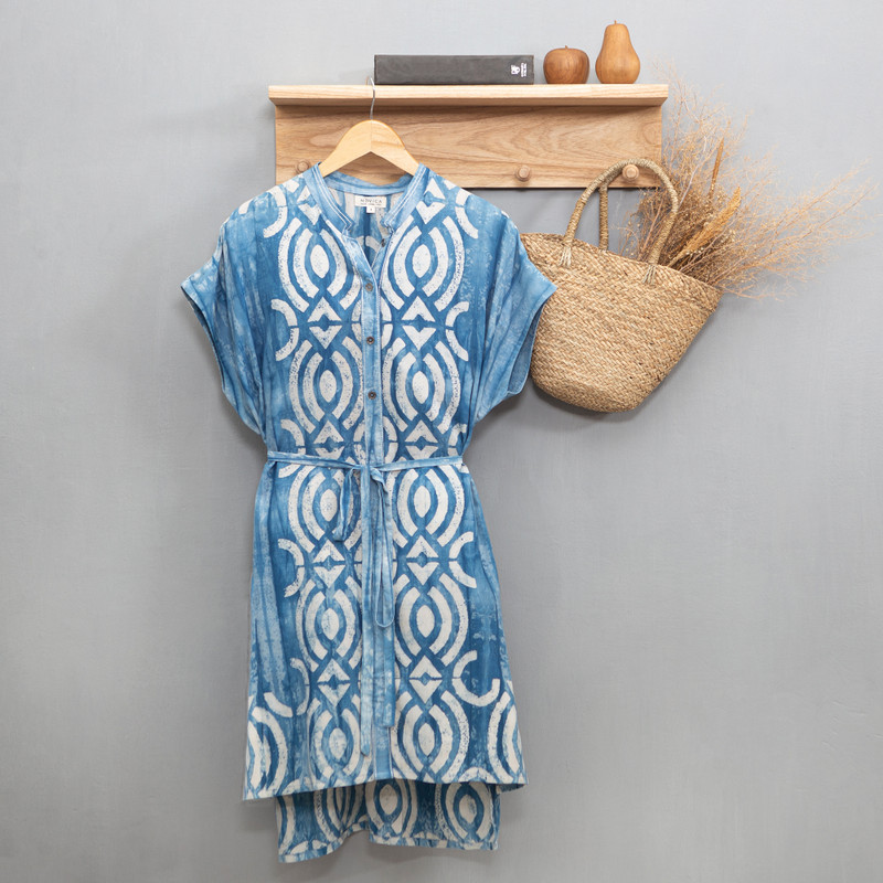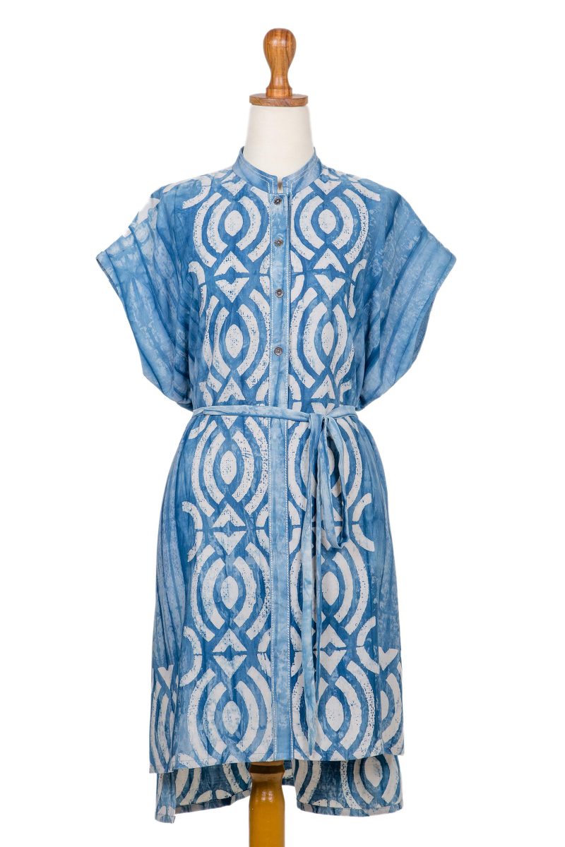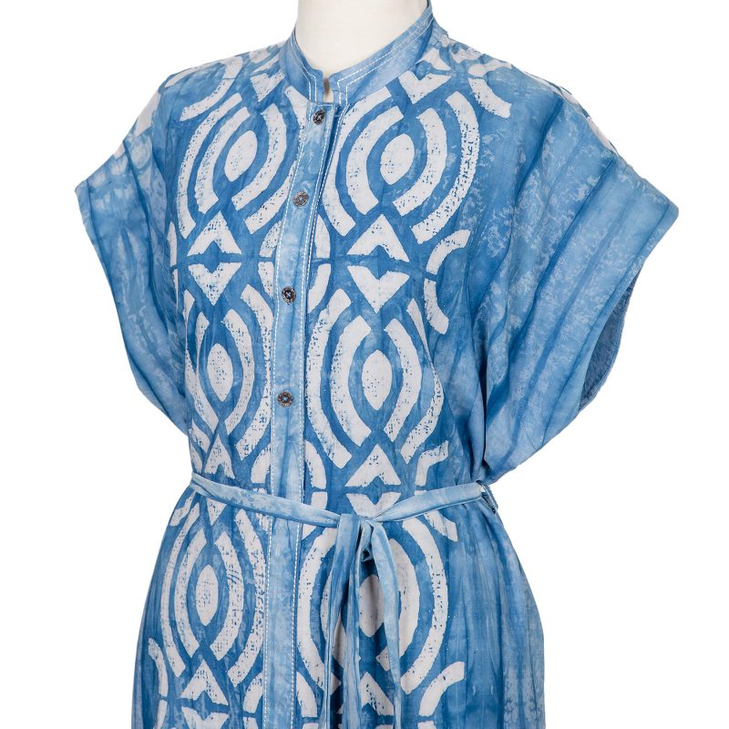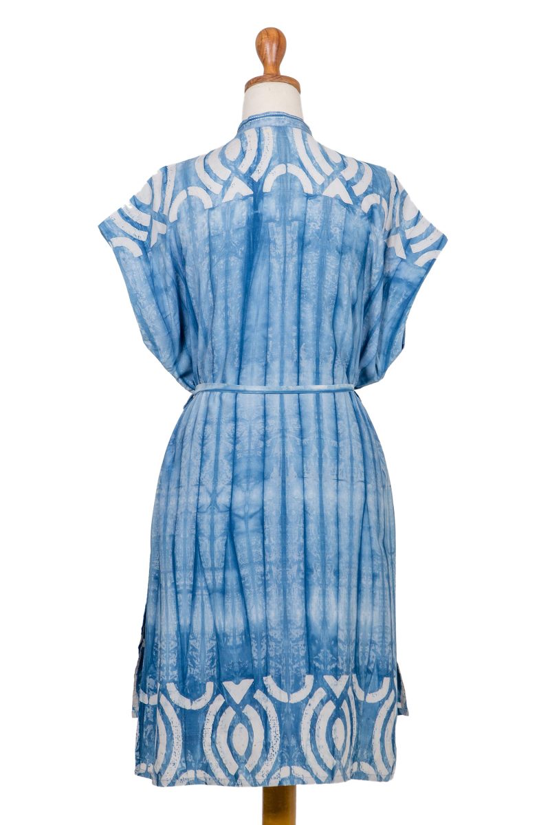 Designed with a high-low hemline and irresistible color, Dani Paraswati's cerulean shirtwaist dress stands out. Hand crafted in Java, the cotton dress features a tie-dyed batik motif, hand-stamped patterns, and a matching tie belt. A round, collarless neckline and row of buttons finish the dress with thoughtful details.