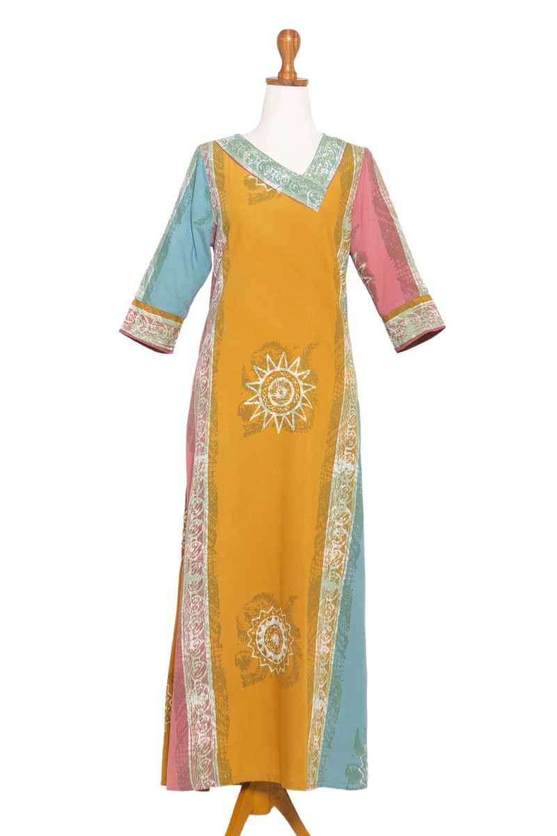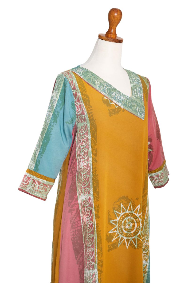 Wayan Arta & Sharon design a comfortable maxi dress for relaxed days using traditional Balinese batik dyeing methods. Crafted from 100% rayon, the dress features an easy-going fit, an asymmetrical v-neckline, and a vintag batik-printed floral and mandala motif that charms in hues of amber, teal, and warm pink.