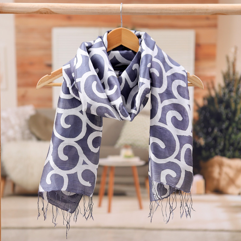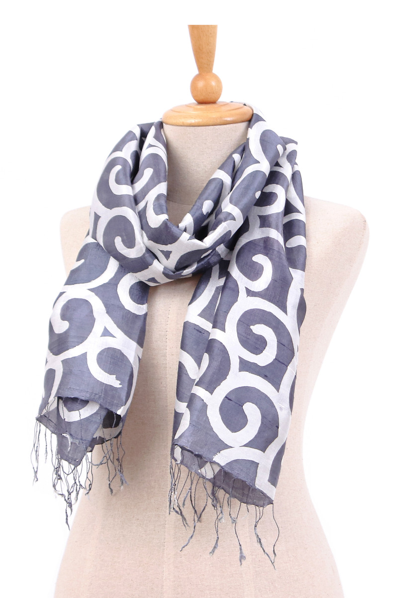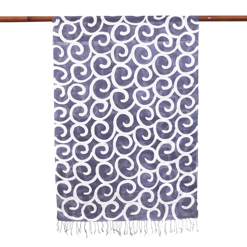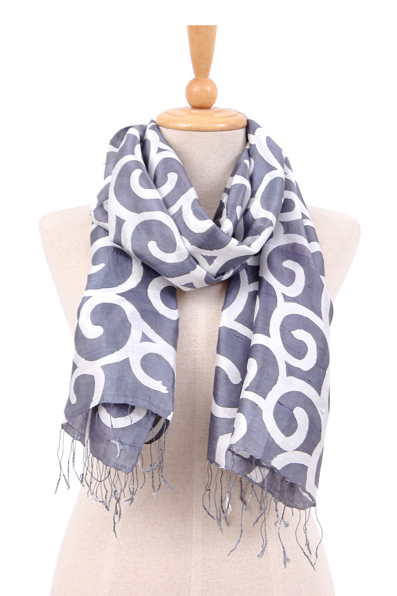 Vinita boasts the innate sheen of natural Thai silk in this fringed design. Working in grey and white, she decorates this stylish scarf with classic spiral motifs, whose bold aura comes to life thanks to a detailed batik technique.