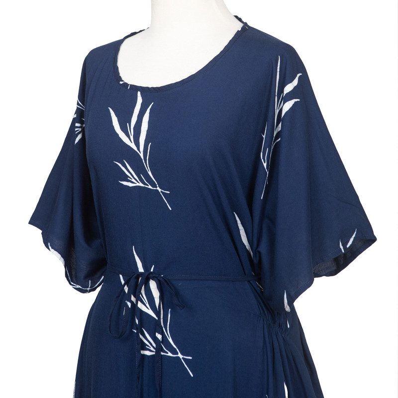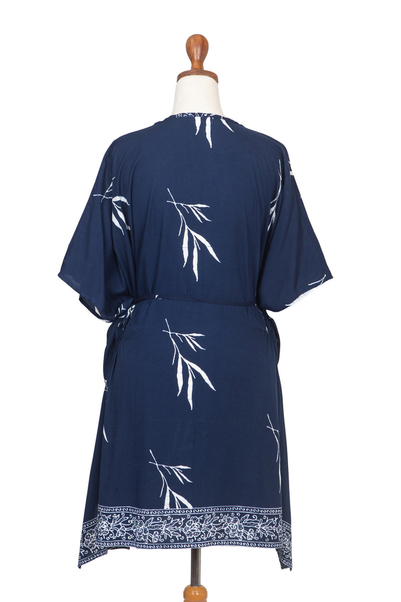 Inspired by nature, Balinese artisan Endah creates this elegant caftan. Crafted from soft rayon, this caftan is decorated using the batik method; a wax resist is stamped by hand onto the fabric before it is treated with colorful dyes, resulting in a stark midnight hue decorated with snow white leaf and floral motifs. A tie cinches this caftan at the waist for a flirty look. This multipurpose piece can be worn as a beach cover-up, a summery short dress or a relaxed top.