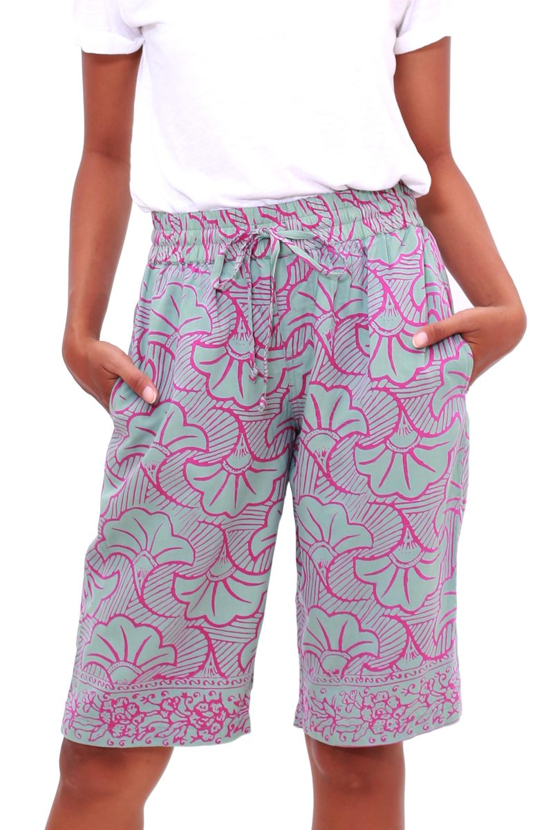 Backed by our 100% Happiness GuaranteeInspired by fall, Balinese artisan Endah creates this lovely pair of shorts. Crafted from smooth rayon, these shorts are decorated using the batik method. A wax resist is stamped by hand onto the fabric before it is treated with colorful dyes, resulting in entrancing mint green and magenta leaf motifs. The shorts feature a drawstring waist and pockets on both sides.