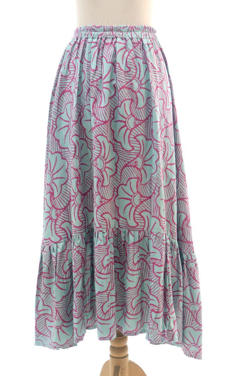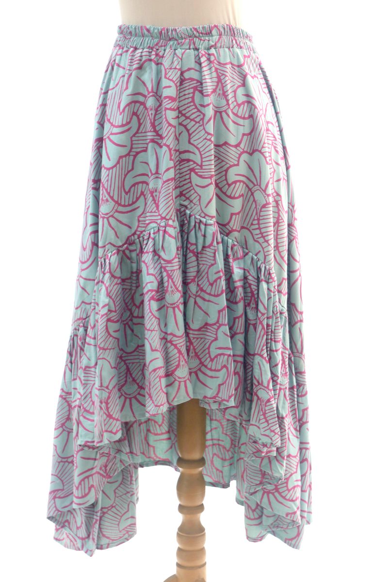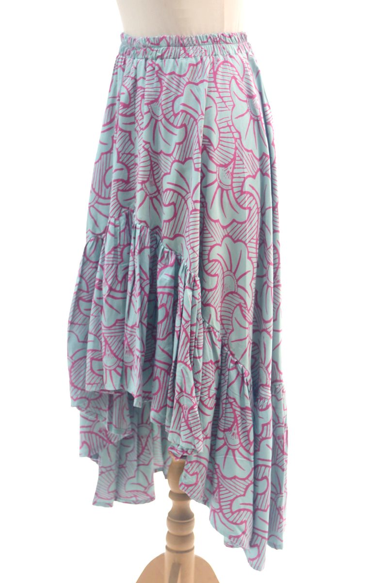 Backed by our Happiness GuaranteeInspired by fall, Balinese artisan Endah creates this lovely skirt. Crafted from smooth rayon, this high-low skirt is decorated using the batik method; a wax resist is stamped by hand onto the fabric before it is treated with colorful dyes, resulting in entrancing green and magenta leaf motifs. The skirt features a comfortable elastic waist and a ruffled hemline.