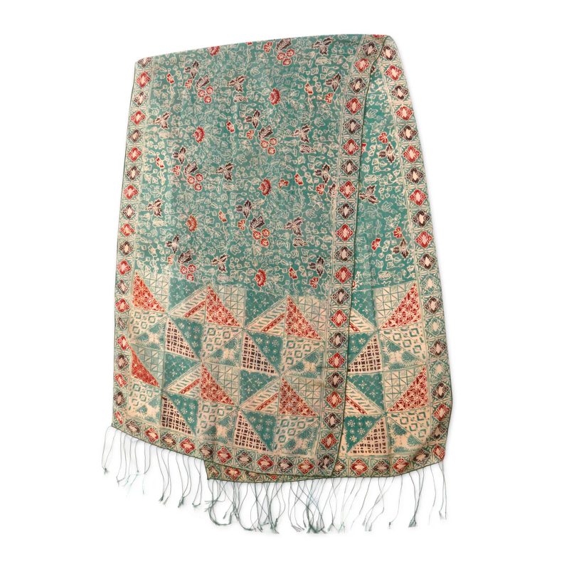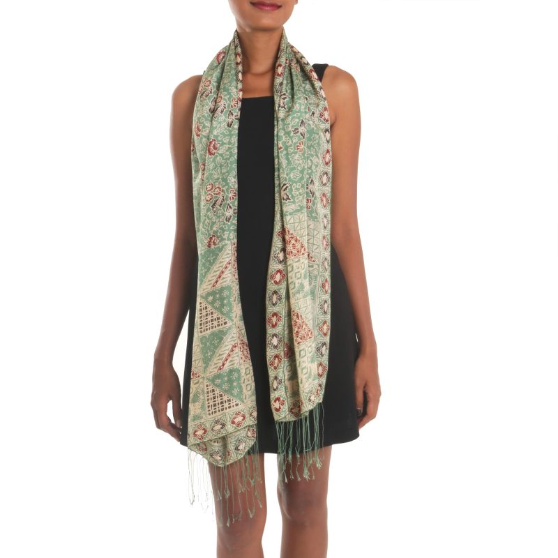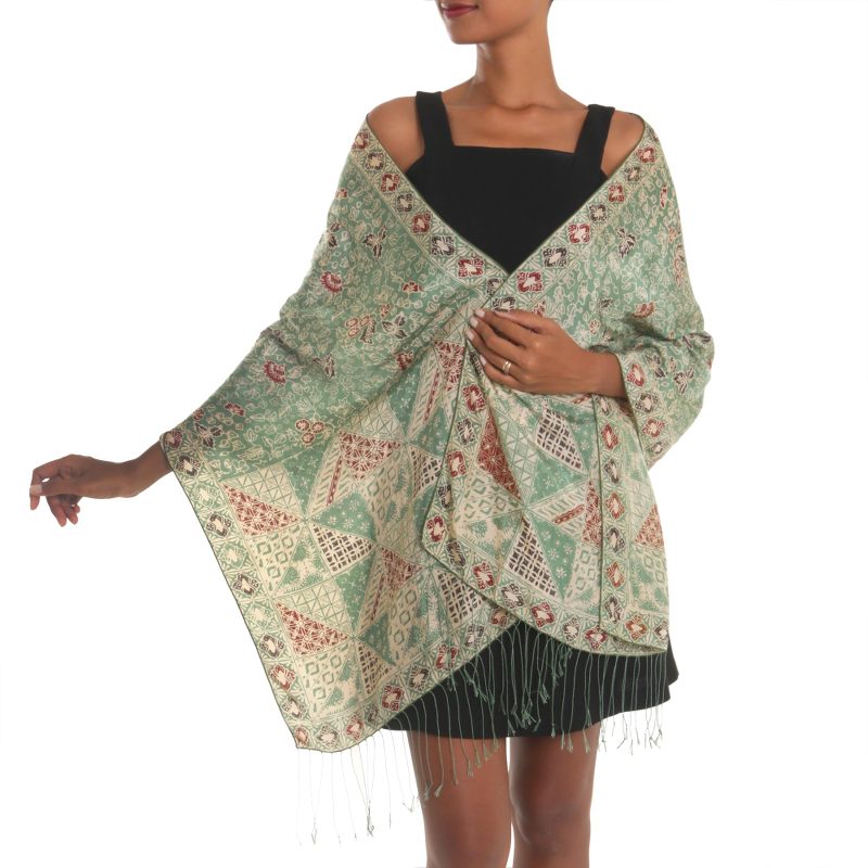This sophisticated beauty from Bali is crafted of fine silk, featuring floral vine motifs in moss green, burgundy, and black over an ecru body. Balinese artisan Yuni Kristina designs this attractive shawl, applying the designs with the traditional batik method, where a wax resist is used with colorful dyes. Long, elegant fringes finish the shawl at each end.