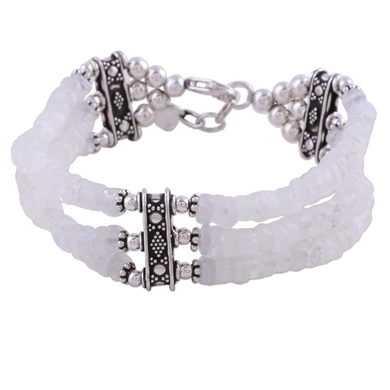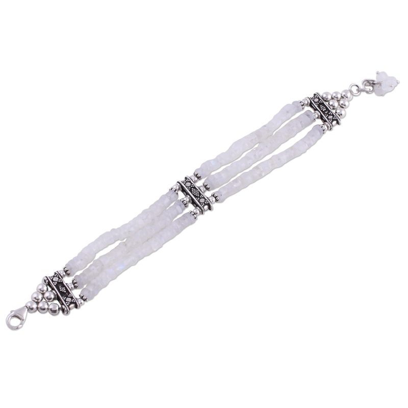 Rainbow moonstone suggests the beautiful purity of new love. From Neeru Goel, this extraordinary bracelet showcases the gem's natural allure. Ornate sterling silver settings link three gemstone strands.