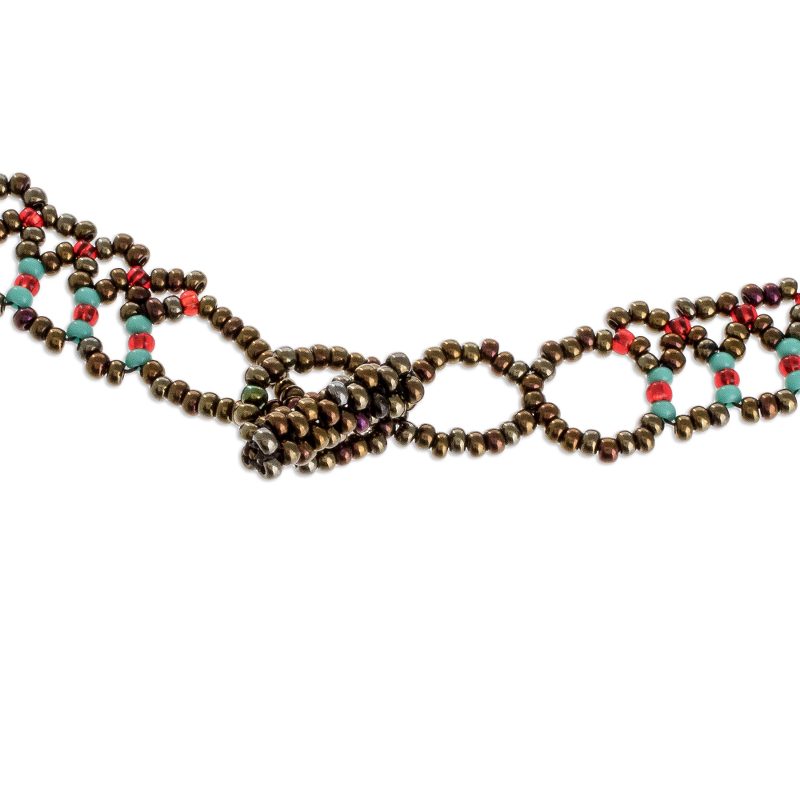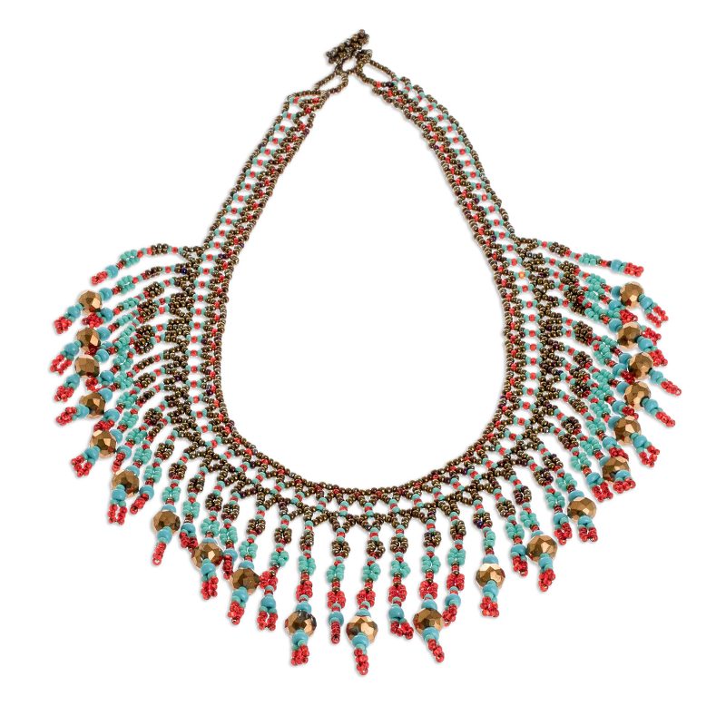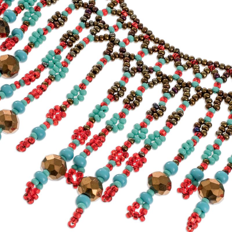 This dramatic beaded waterfall necklace is the original creation of Mirian Zet in Guatemala. The artisan strings bronze, red and turquoise crystal and glass beads in elaborate patterns to create the necklace, which is secured by a beaded toggle clasp.
