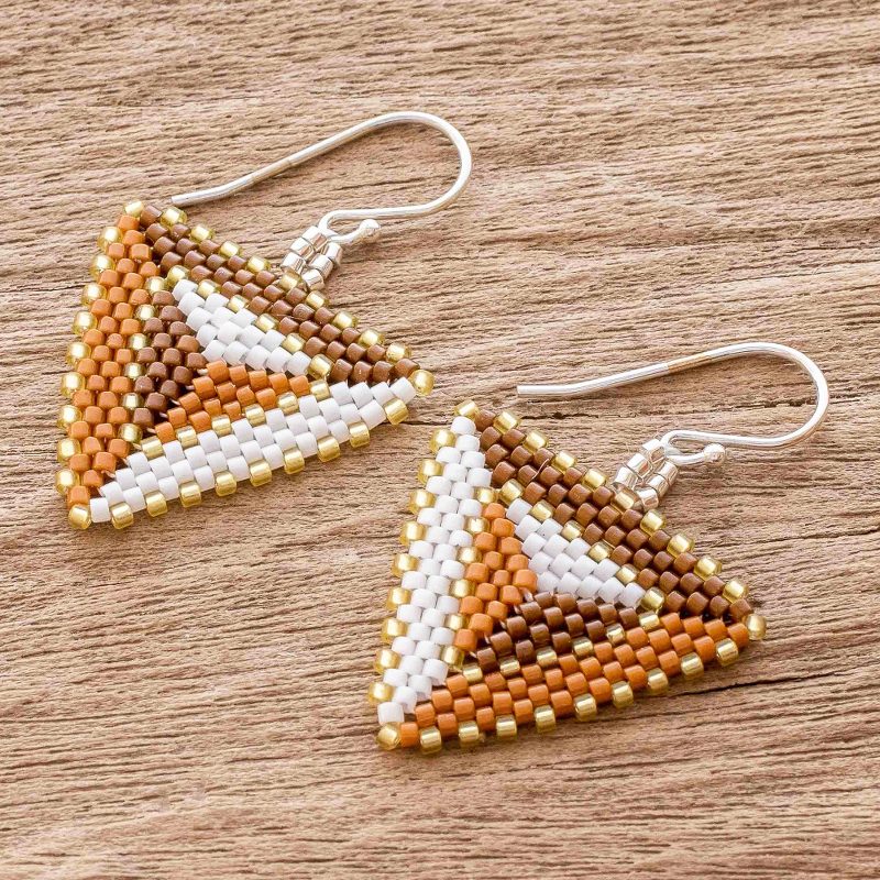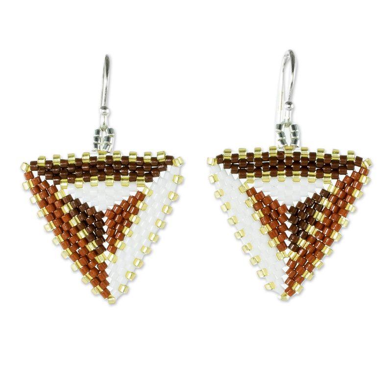 Backed by our 100% Happiness GuaranteeUsing tiny glass beads in nutmeg, spice, white and gold, the Pearls of the Sea Youth Group creates these lovely dangle earrings. The artisan cooperative consists of young women in a remote area of El Salvador who handcraft jewelry to help support their families and improve their education. The triangular earrings swing from sterling silver hooks.