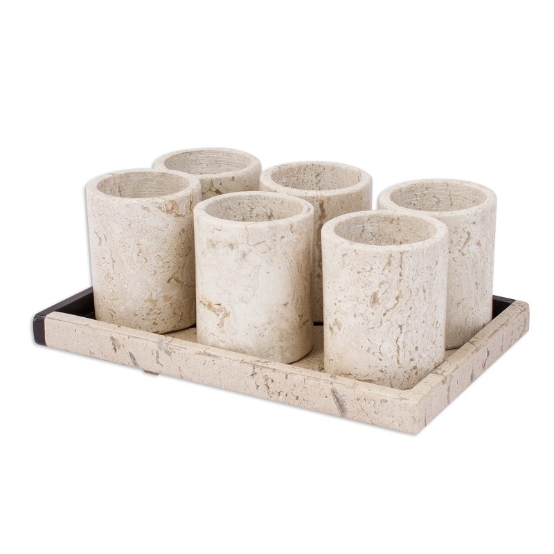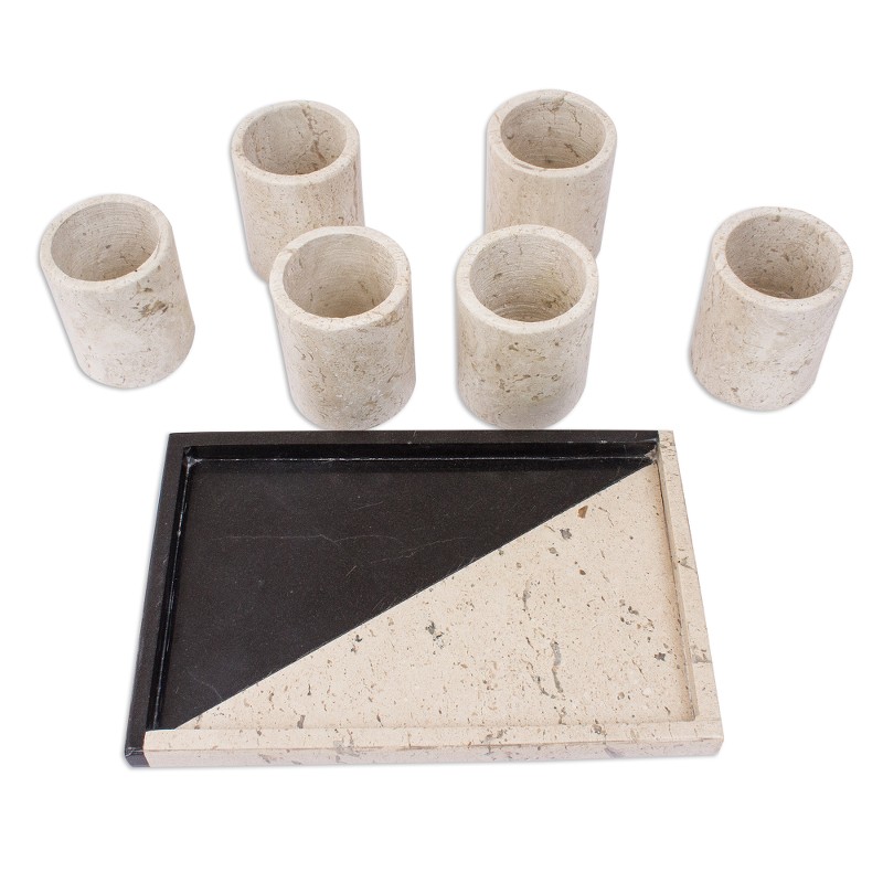 Created by the talented artisans of Mexico's Sierra Family, this set of six tequila glasses will make a wonderful addition to your next party. Each tequila glass is crafted from beige marble, arriving with a black and beige tray with an oblique pattern.