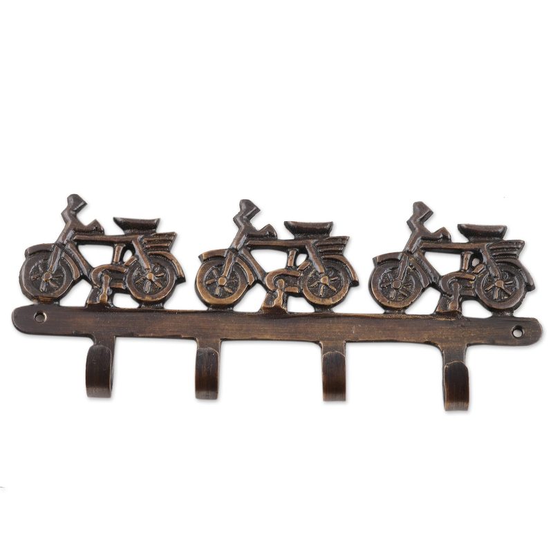 Backed by our 100% Happiness GuaranteeAnd they're off! India's Khalid Ali presents this four-hook wall hanger with three bicycles, cast in brass and enhanced with a lacquer finish to give it a rustic appearance. The hanger comes with screws for affixing to your wall.
