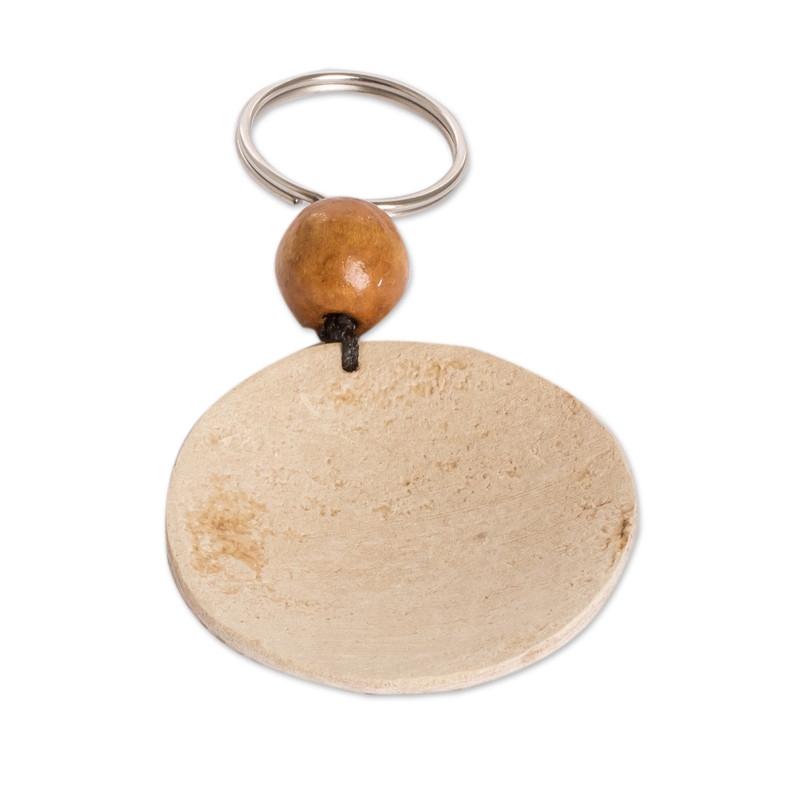 An exotic bird perching on a branch embellishes this keychain carved by hand in dried calabash gourd by the artisans of Costa Rica's Guevara Cabalceta Family. The practical and fabulous accessory is crowned by a pinewood bead and comes with a nickel ring.
