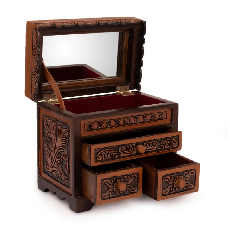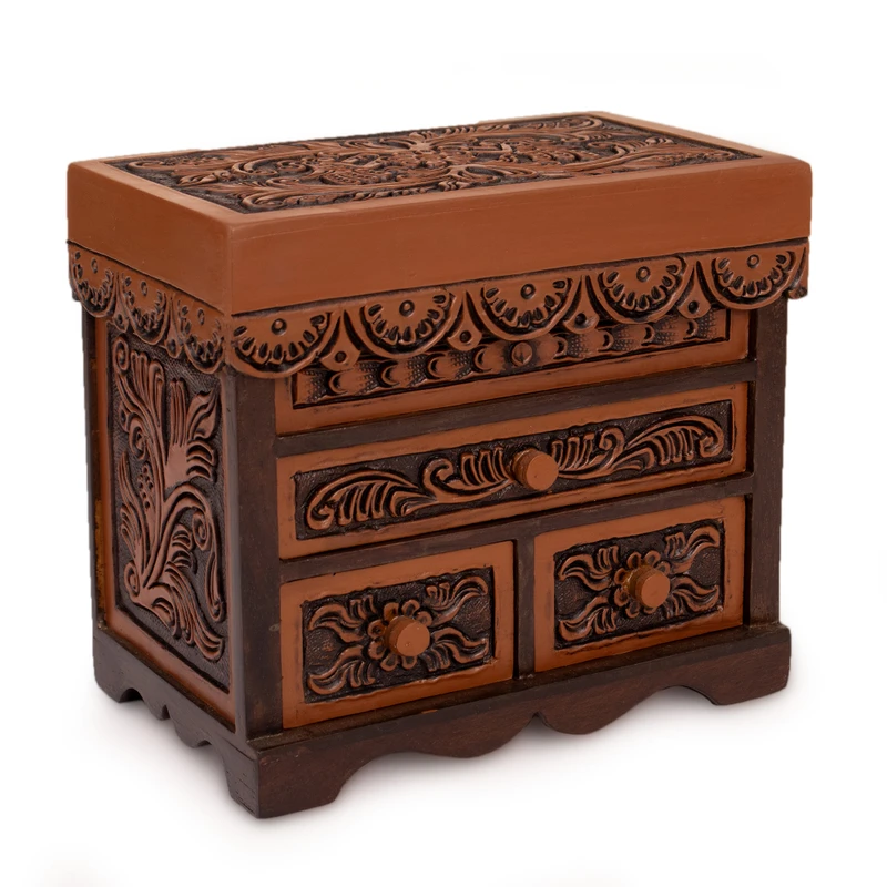 Backed by our Happiness GuaranteeBirds find a haven amid lavish foliage on an heirloom jewelry box. By Kelvin Maguiña, it is crafted of wood and covered with richly tooled leather, embossed by hand. The lid opens to reveal a mirror, and two drawers beneath organize smaller treasures.