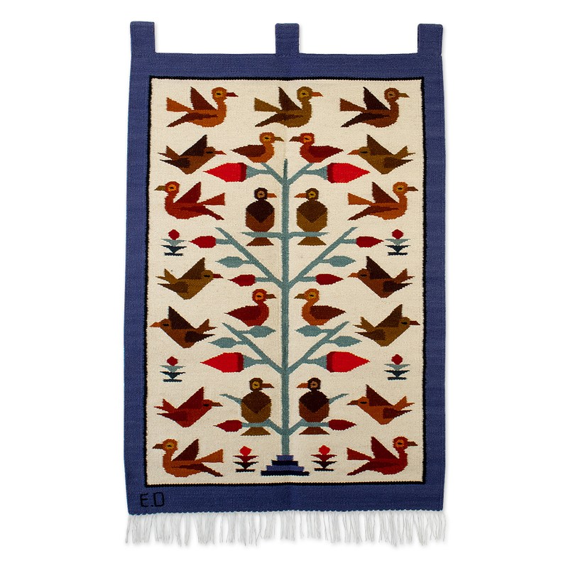 Backed by our 100% Happiness GuaranteeA flourishing tree offers a peaceful home to the diverse birds flying and resting around Eliazar Ochoa's newest creation. Motivated by his love for nature and culture, the artisan depicts this enchanting scene in the traditional Andean style, choosing a palette of blue, red, turquoise and brown hues that create a captivating look. The tapestry is also handloomed from wool, using advanced techniques that make the piece a great model of Peru's high-quality textiles.