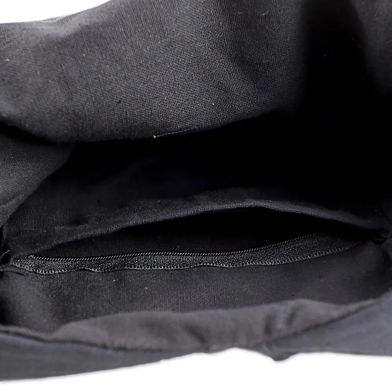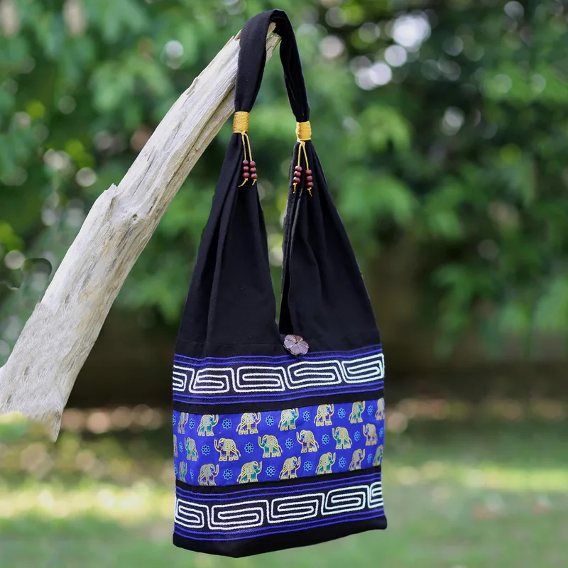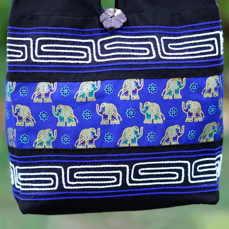 Thai artisan Jiap Rojjana designs this stunning cotton blend shoulder bag that closes with a coconut shell button. Traditional Thai elephants march across a vibrant sapphire background, with blue and white embroidery completing the design. Golden thread and rain tree wood beads adorn the black straps. The inside of the bag features a black cotton lining and a zipper pocket.