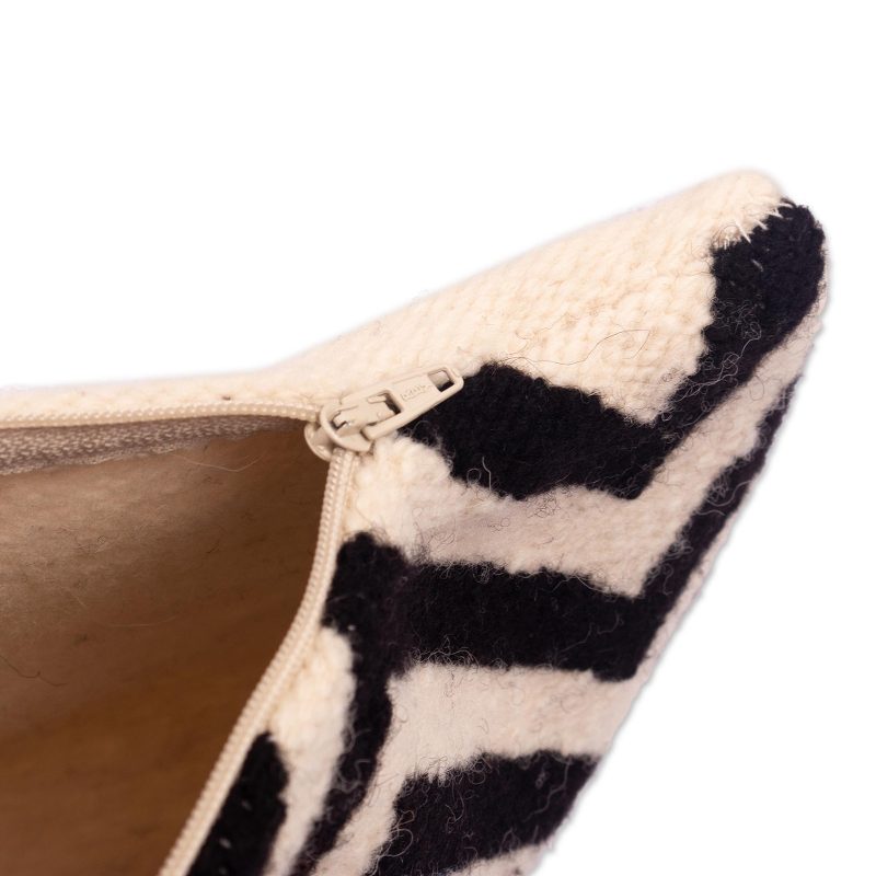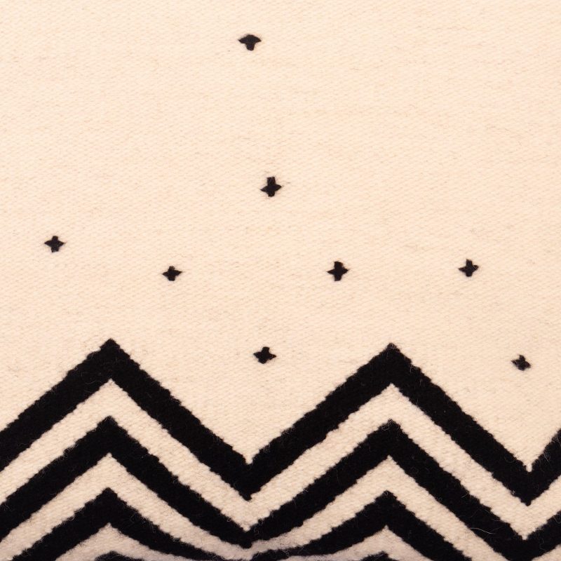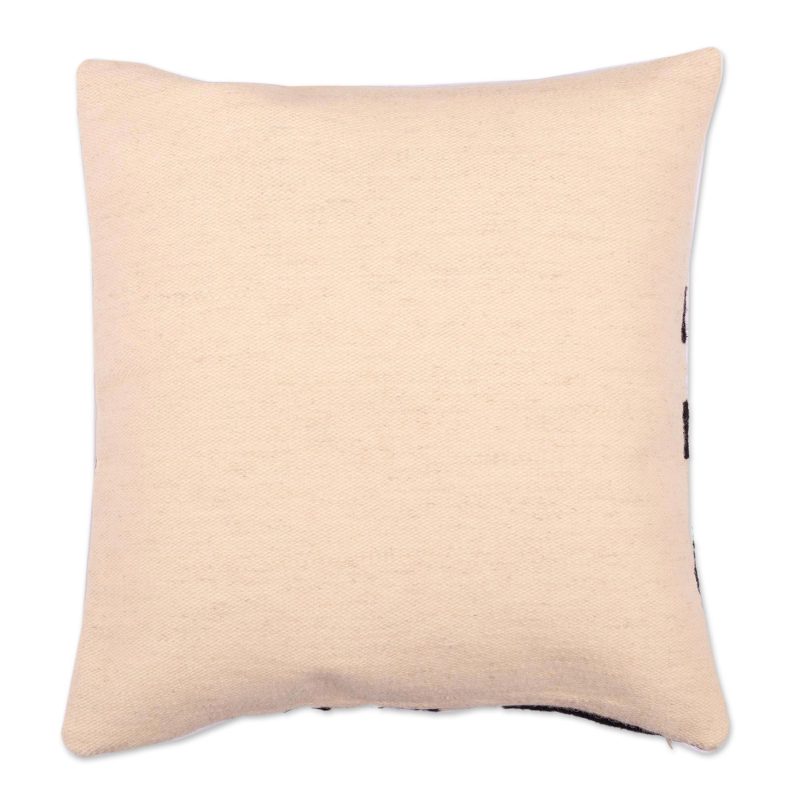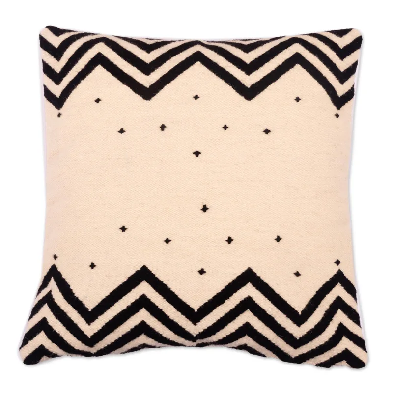 Textile artist Cerapio Vallejo says "I draw inspiration from our ancient Peruvian cultures, Andean village life, and from our snow-capped mountains." However, that does not mean he does not reinvent and modernize the designs he has inherited. With this wool cushion cover, Vallejo takes on a simple bold black and ivory combination, but minimalizes the black, creating a airy feeling with the design. There is a zipper that allows for the insertion of a cushion.