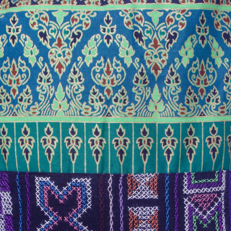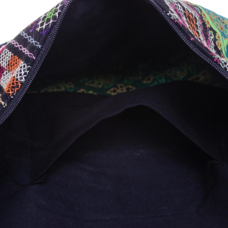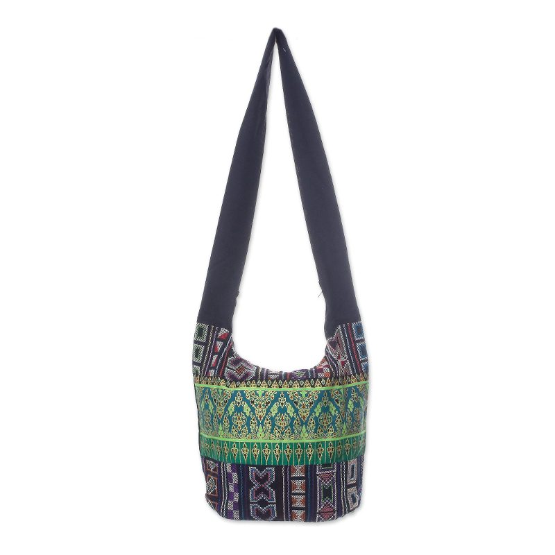 Jiap Rojjana of Thailand presents a shoulder bag made from cotton blend fabric with multi-color geometric motifs on a black background. In the center of the bag is a horizontal band of green fabric with a floral motif made by a Thai hill tribe. A long, broad strap in black allows the bag to be worn over the shoulder or across the body. The ample interior closes with a zipper and is lined in black cotton with one open pocket set into the lining.