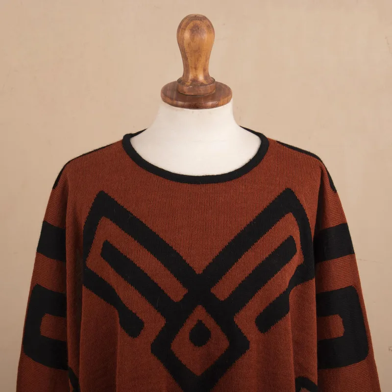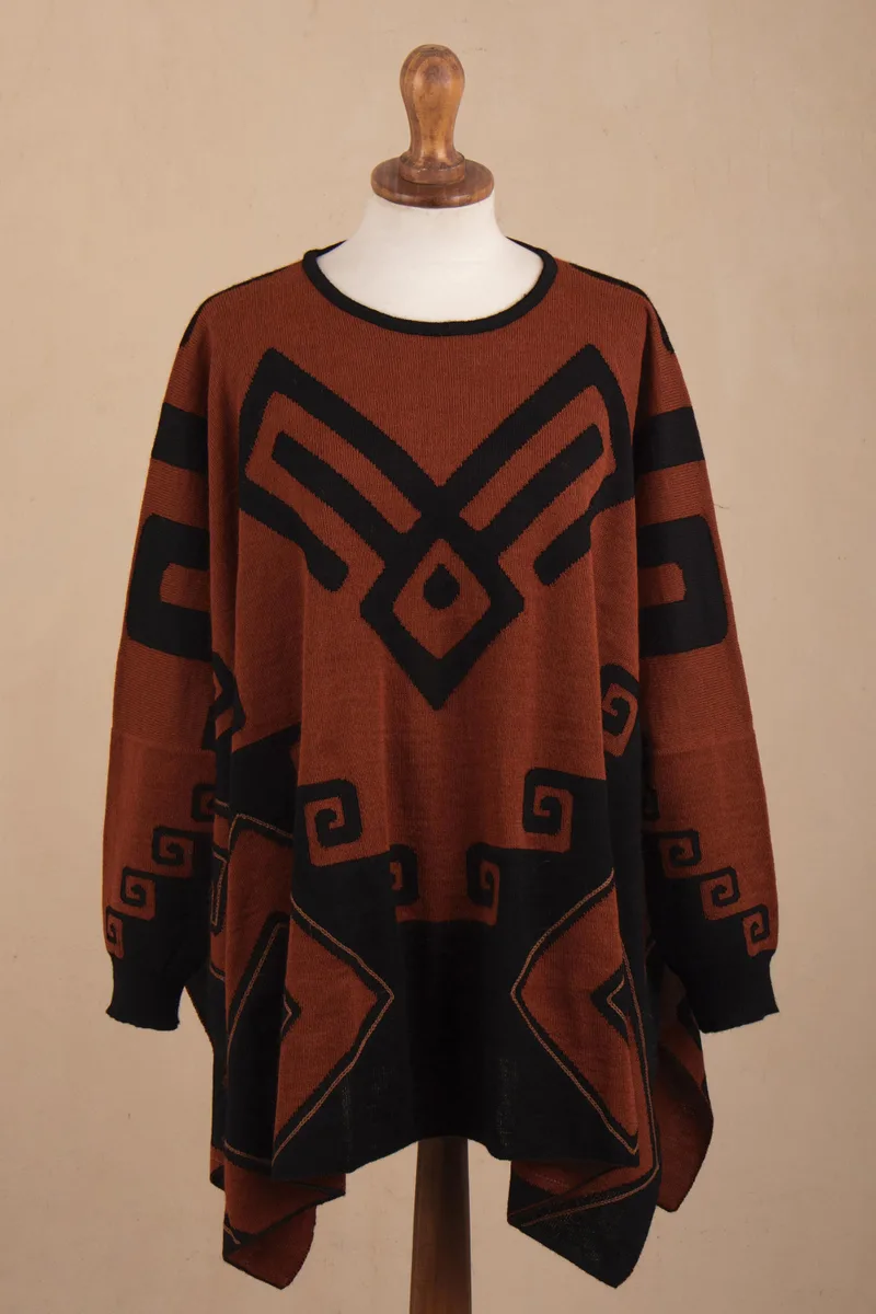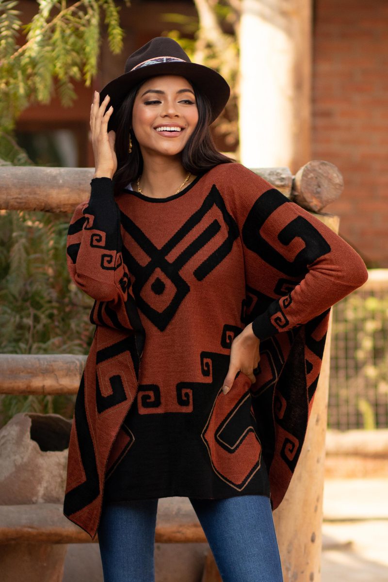 Backed by our 100% Happiness GuaranteeDrawing inspiration from the textiles of the ancient Inca, Peruvian artisan Waldo Berrios creates this stunning and lovely poncho. He works with a luxuriously soft alpaca blend, knitting this sleeved poncho to feature geometric spiral patterns in contrasting hues of russet and black.
