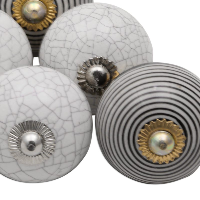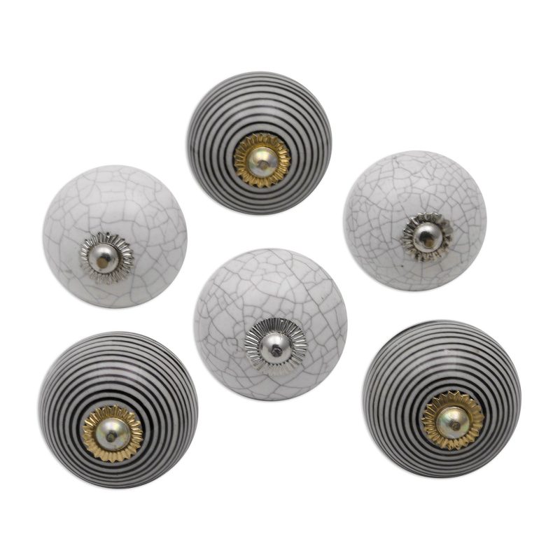 Adding a modern touch to your kitchen or bathroom, this set of six round ceramic knobs features hand-painted stripes and veins in black, white, and grey. India's Chirag Choudhary designs this set, complete with fixtures of brass, nickel plated iron, and iron.