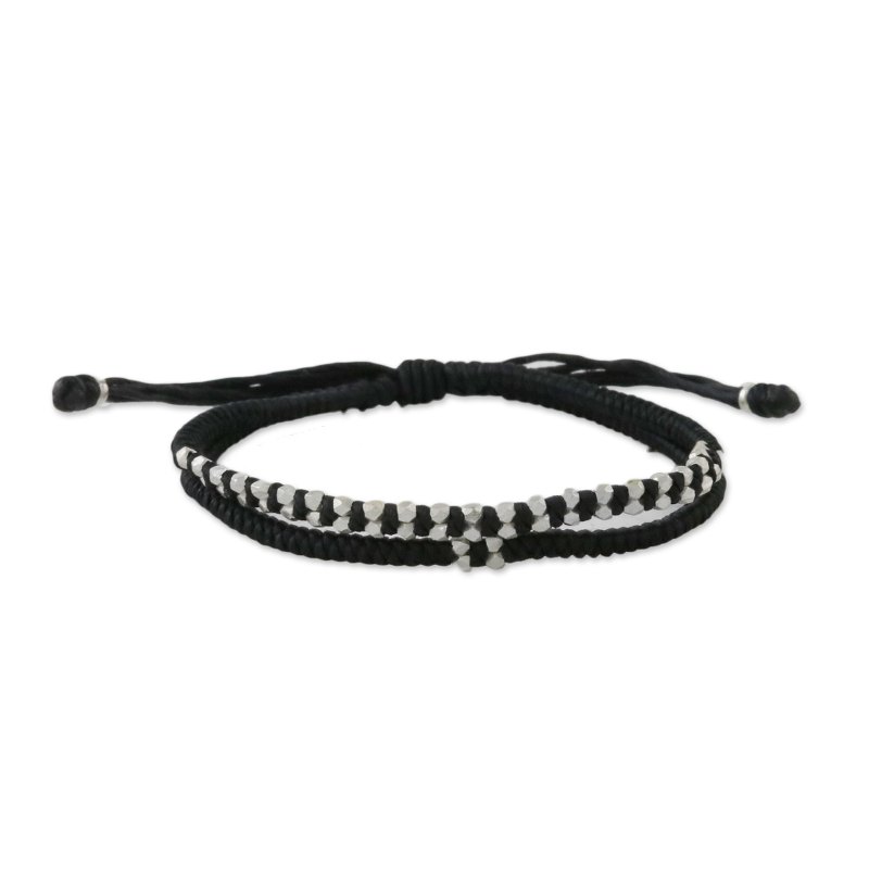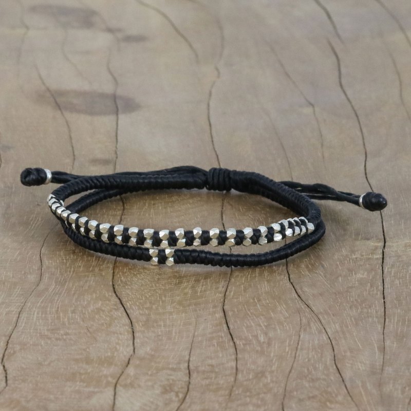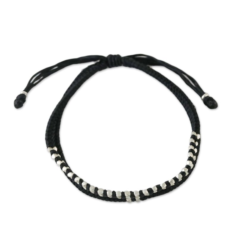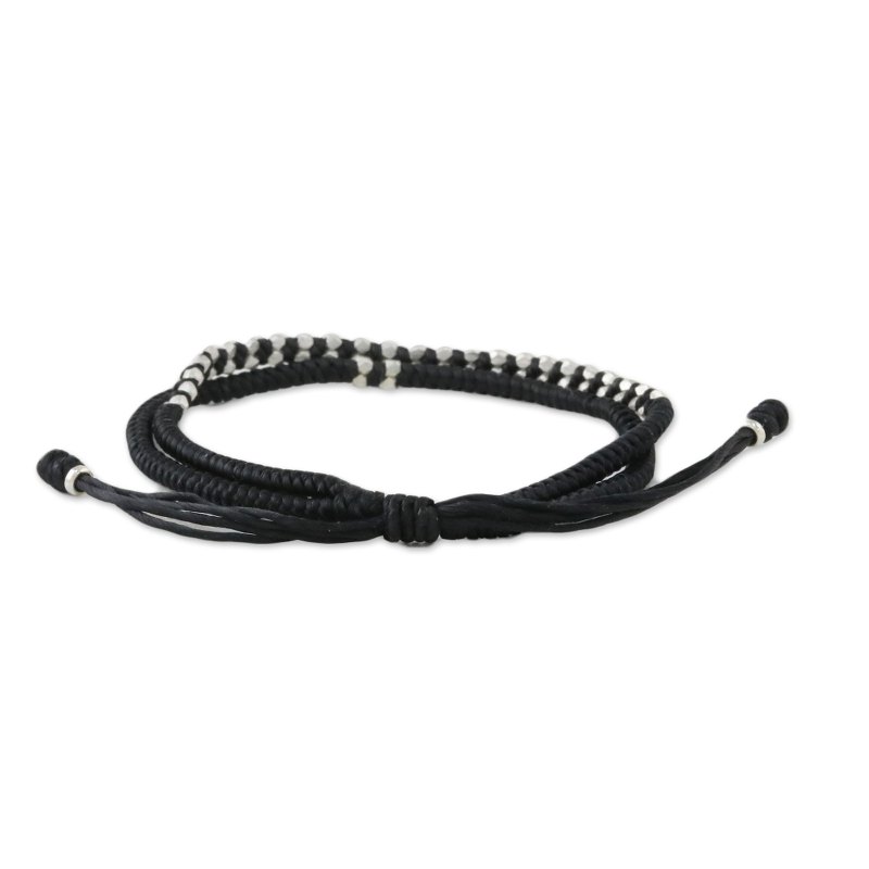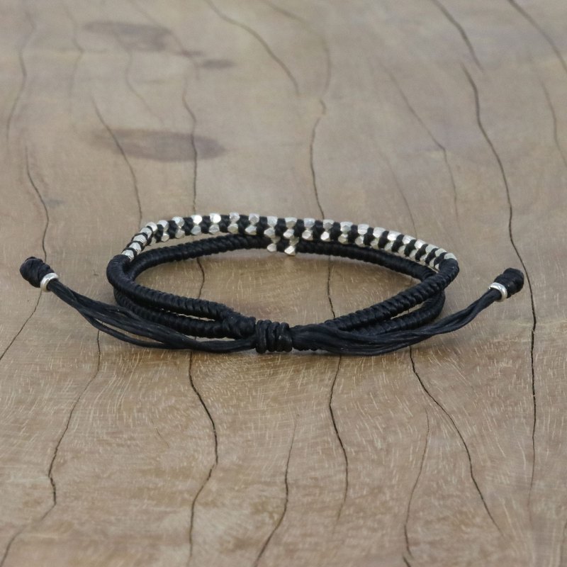 Braided cords in jet black become a casual bracelet for men or women from Thai artisan Napapat. The artisan embellishes the bracelet with nugget-like beads of Karen hill tribe 950 silver. A sliding knot allows you to adjust the bracelet to the desired length.