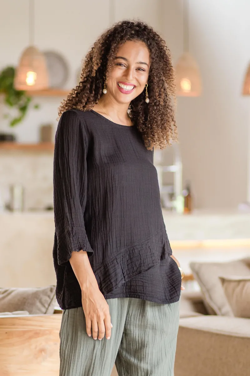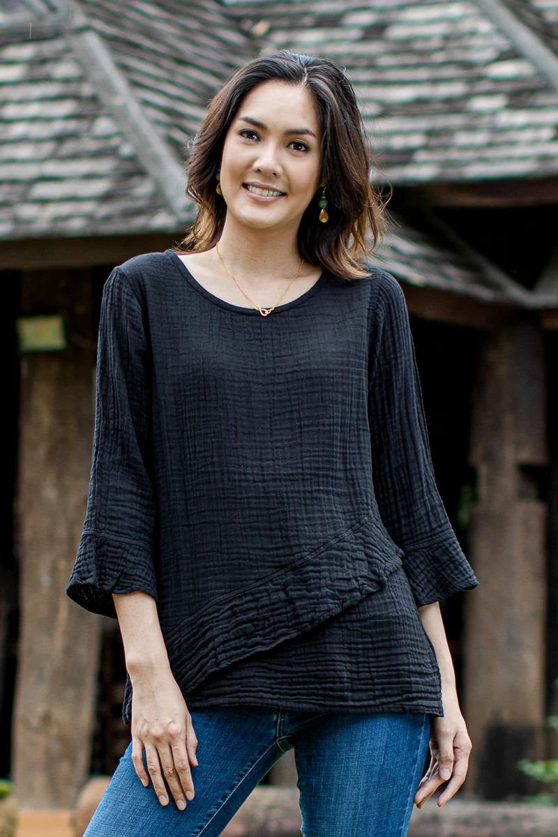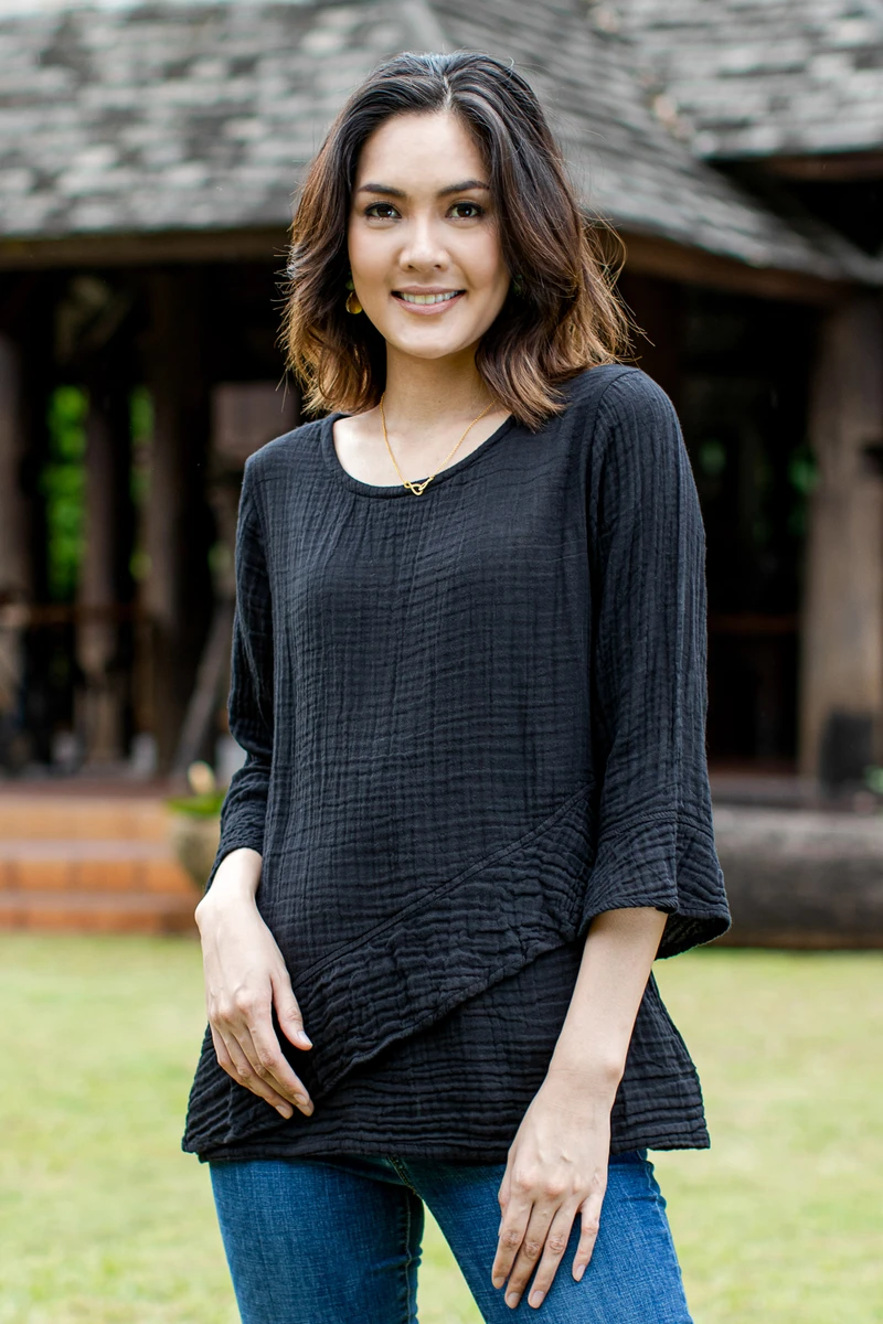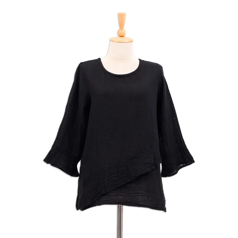 Presented by Ying and Joy, this breezy black blouse features an irresistible asymmetrical detail. Hand crafted in double-layered cotton gauze which is prized for its soft, lightweight texture. At the hemline, an asymmetrical ruffle gives the blouse subtle yet elegant flair.