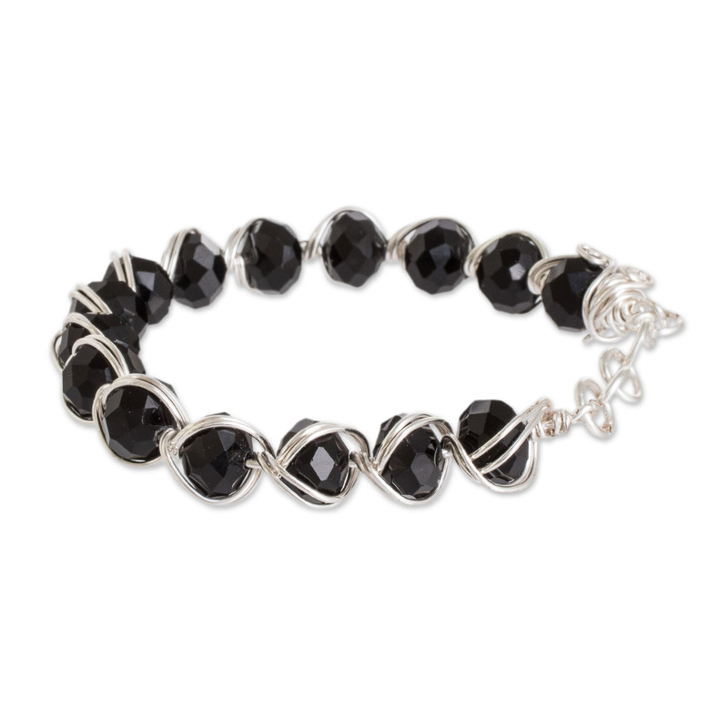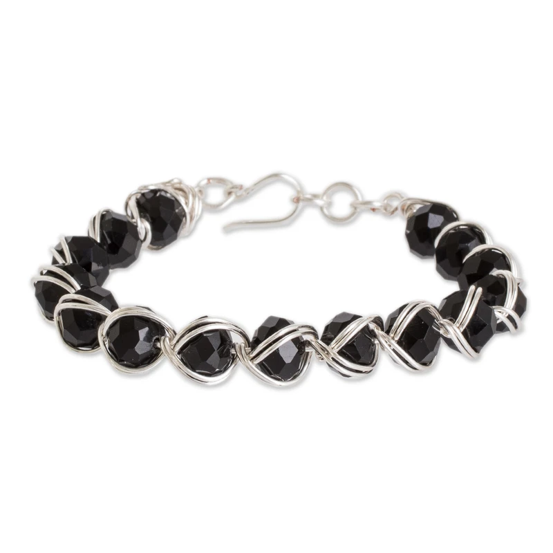 Black, the color of power and mystery, takes over a bewitching crystal beaded bracelet handcrafted by Marielos and Tania from Costa Rica. Working with polymer-coated copper wires in a silver tone, the artisans add a luxurious touch to the accessory, making the perfect complement for any style.