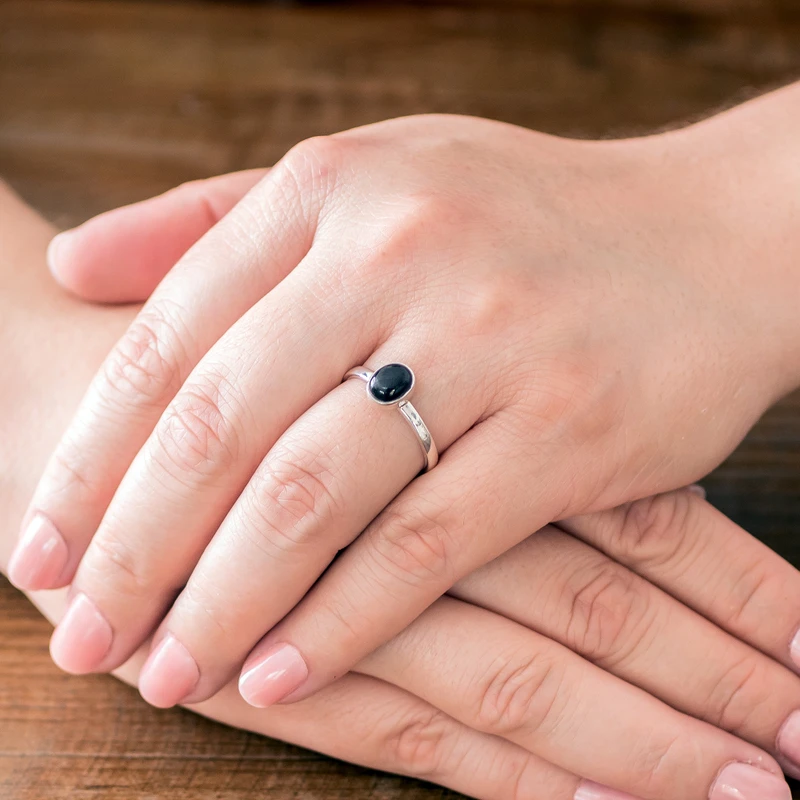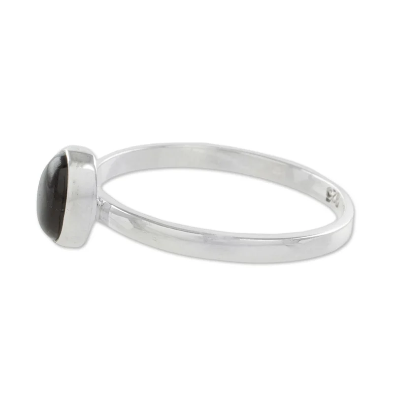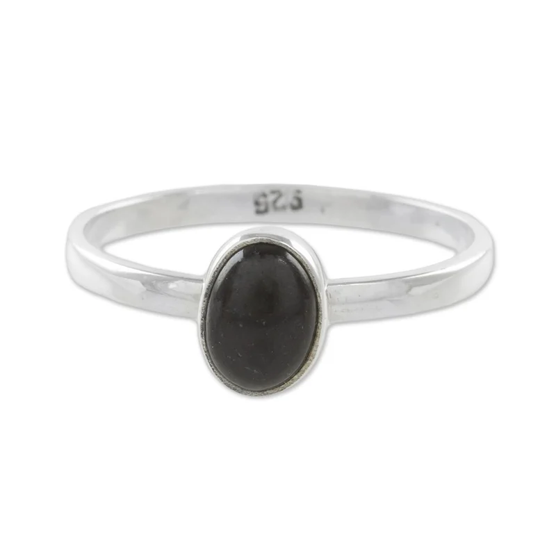 Backed by our 100% Happiness GuaranteeCrowned by an oval bezel of black Guatemalan jade, this simple and exciting single stone ring from Guatemala features a design by Zandra Lorena Sajbin. She crafts the band of sterling silver, circling the finger with a high-polish elegance.