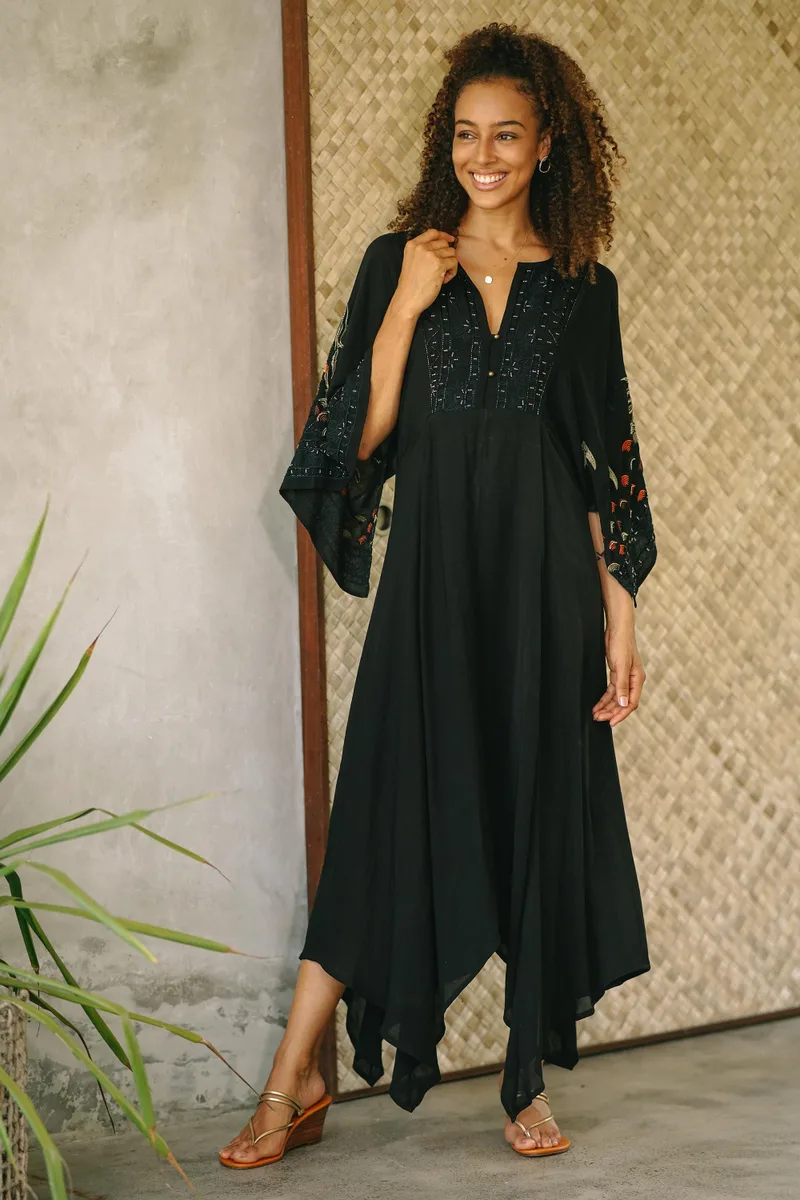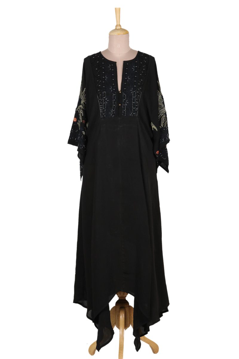 Backed by our 100% Happiness GuaranteeThis flowing holiday dress is the ultimate in chic. Hand embroidery and delicate tonal black beadwork decorate the front and back yoke, while colorful flowers and more beading lavish the three-quarter length kimono-style sleeves. The polyester crepe dress drapes beautifully and finishes in a handkerchief hem. The v-neck bodice features two antiqued brass buttons with a hidden zipper along the back. Cotton lining.