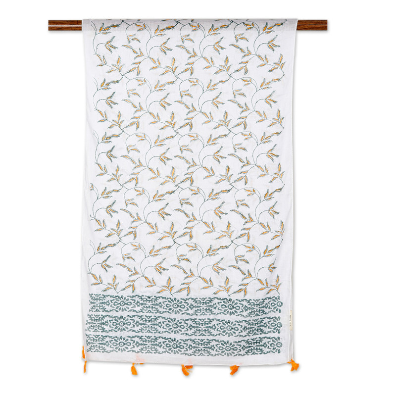 Add an elegant and bright accent to your outfits with this cotton shawl handcrafted by Indian artisans following the design of Rajnandinee and Srabonti. Using the traditional block printing technique, the artisans embellish the garment with a leafy saffron pattern and green floral motifs, adding charming tassels for a dapper look.