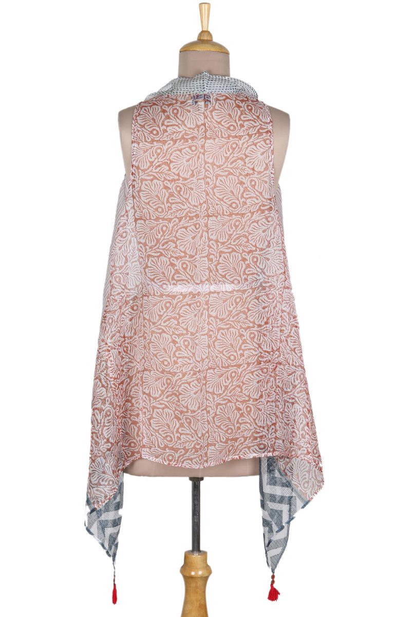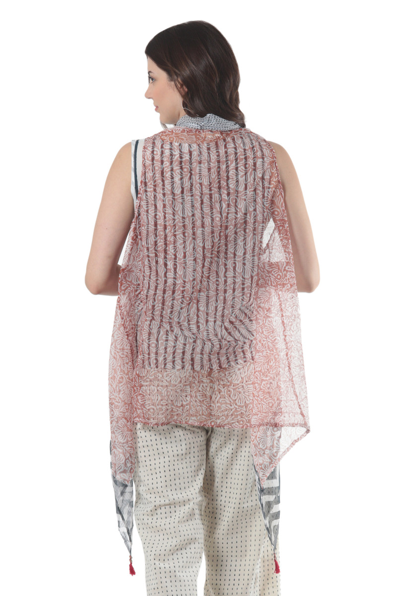 Ideal in hot and humid weather, this lightweight vest from India's Ritu Agnihotri is woven from gossamer-like kota doria, an airy blend of cotton and silk popular for saris. The artisan then hand prints the garment with an arresting pattern in cool navy.