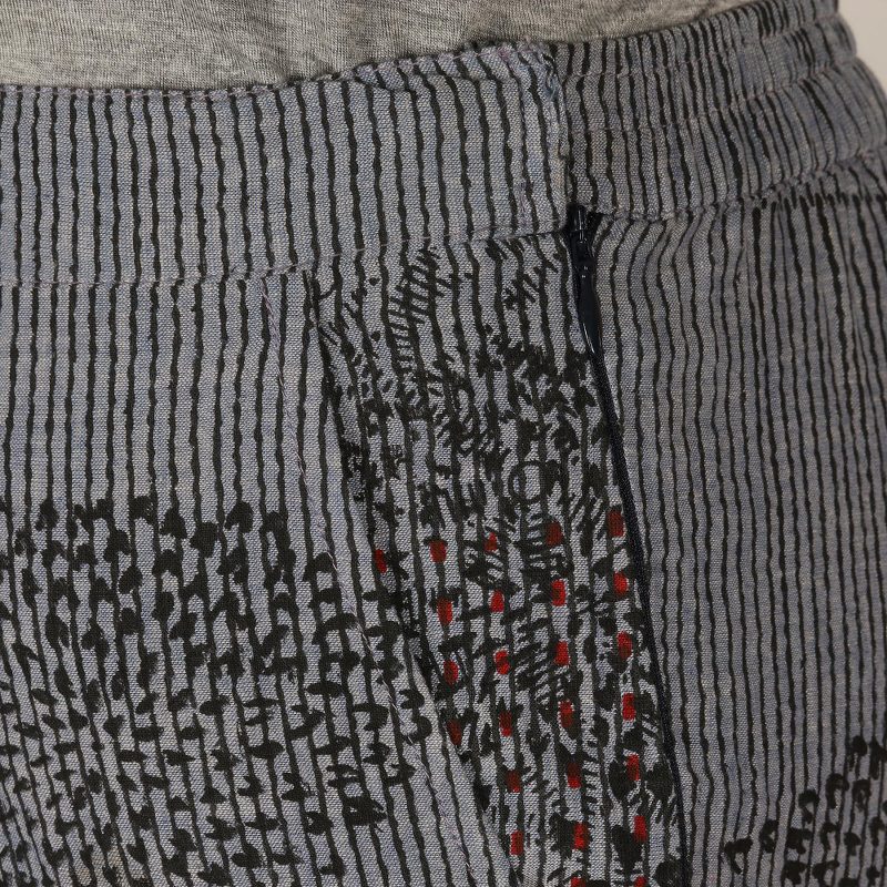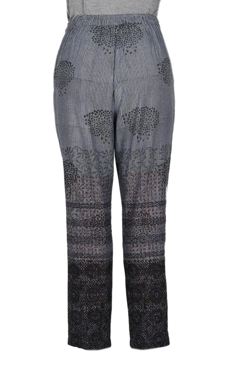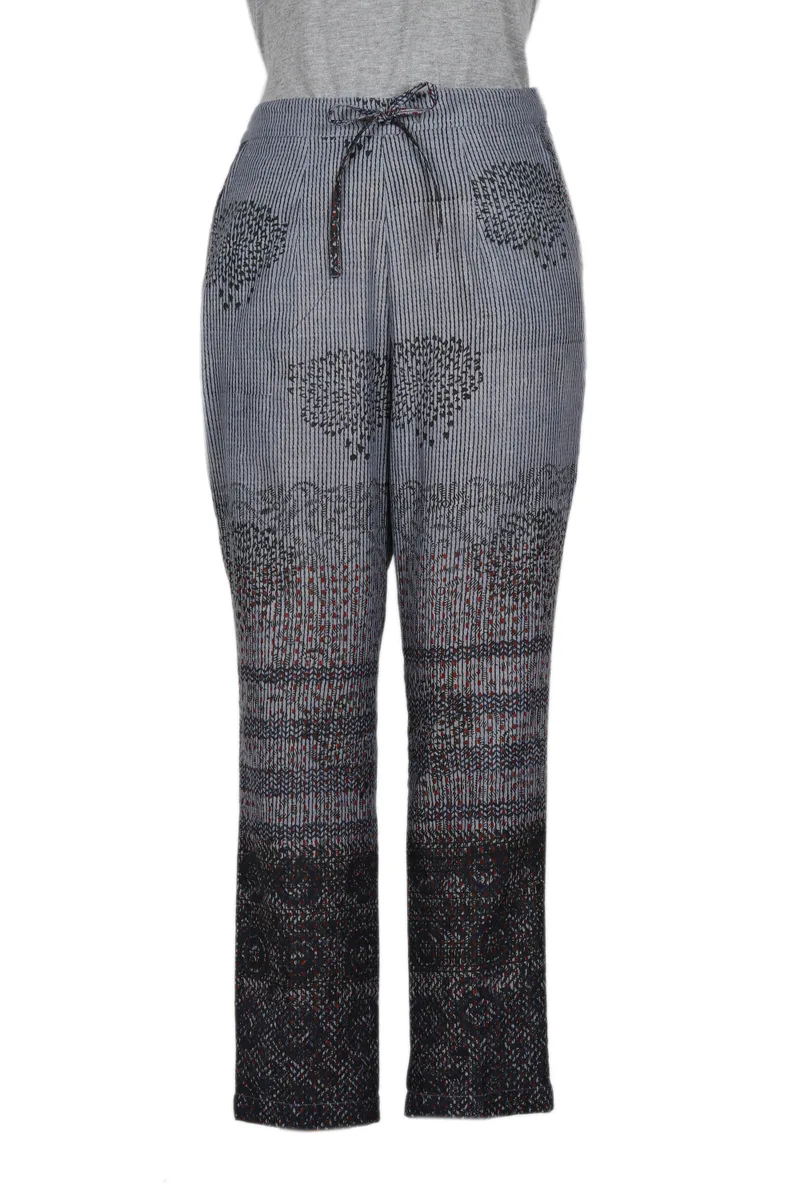 Backed by our Happiness GuaranteeThese unique pants designed by Indian artisan Ritu Agnihotri are perfect for a casual summer outing. Crafted from cool, breathable cotton, the trousers feature a hand block-printed pattern on a light grey base. The artisan adds an elastic waistband at the back, a front tie drawstring, a side zipper that closes with an eye hook. Two side seam pockets make welcome additions.
