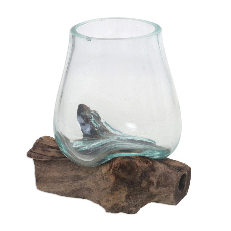 Let your mind wander to a scene of foamy blue water, rhythmically crashing into rocky cliffs. Each out-tide exposes an outcrop of jagged earth cloaked beneath the deep-blue ocean. It could be serene, or it could be an illustration of the power of the Earth's bodies of water. Made Sadia creates a stunning representation of tumultuous tidal-surges that fits on your desk with this handcrafted blown glass vase. Beautiful albesia wood is reminiscent of jagged rocks, while the clear handblown crystal takes on the nature of the tides for an eye-catching decorative piece that is the perfect addition to your home.