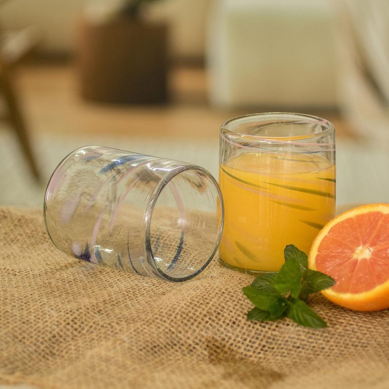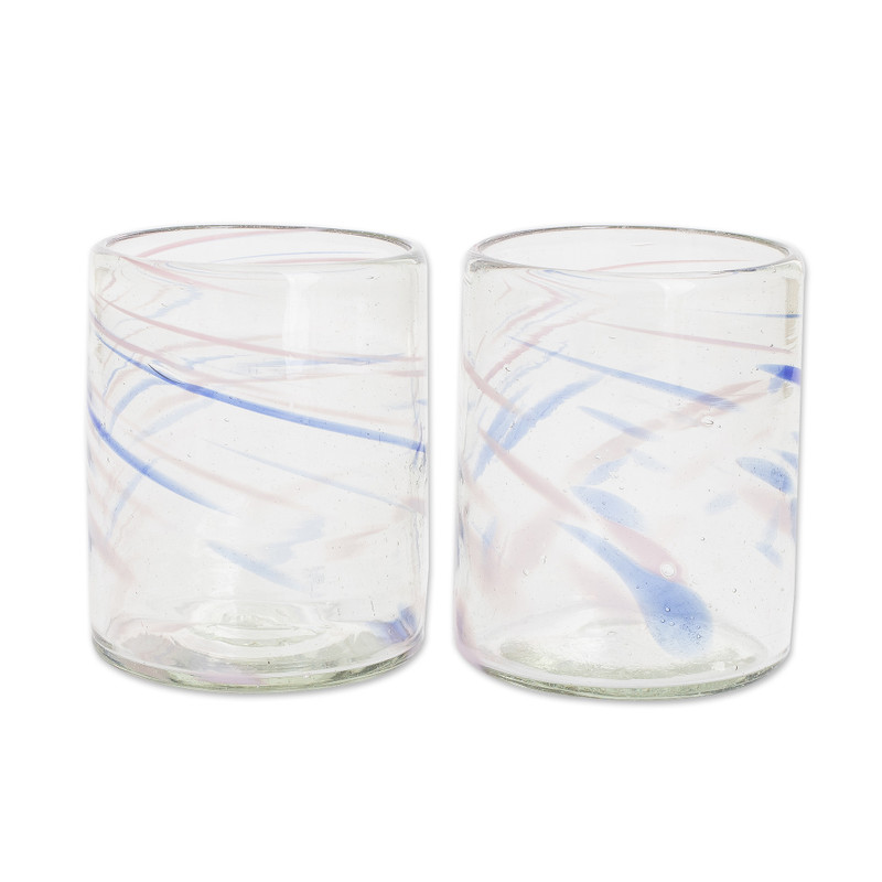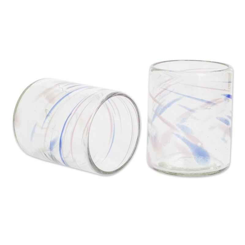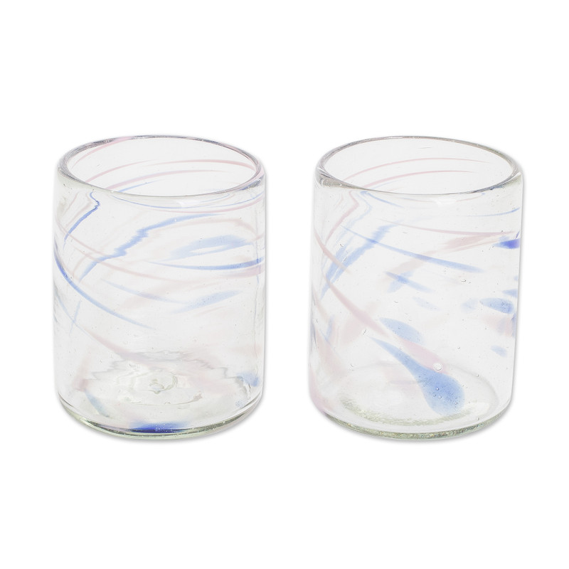 Blue and violet accents add a touch of sweetness to this pair of rocks glasses crafted by Guatemala's Cantel Blown Glass Artisans. Experts in traditional handblown techniques, the team uses recycled materials to create this set, enhancing each with little color accents for a unique look.